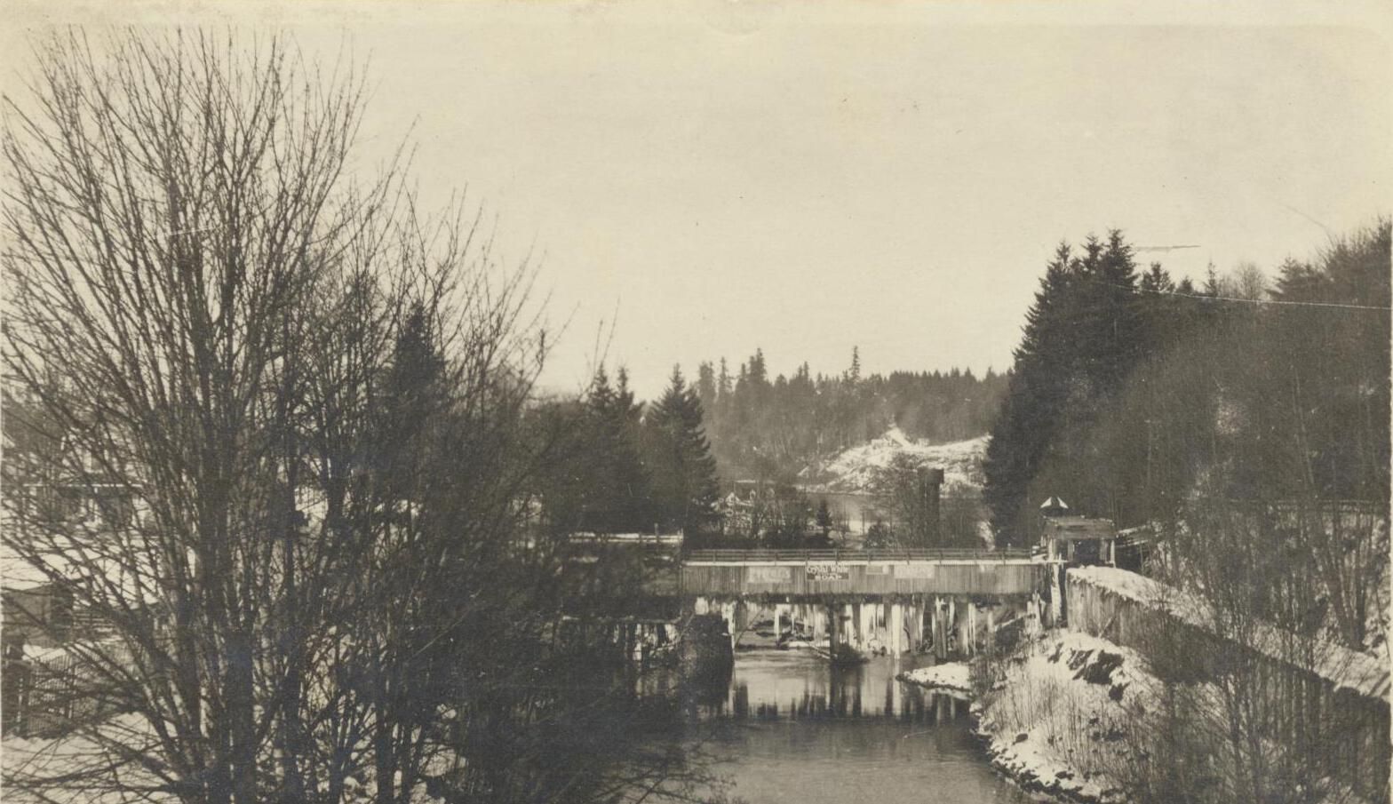 Photograph. Deschutes River, showing middle falls/dam and penstock feeding water to #2 power house.