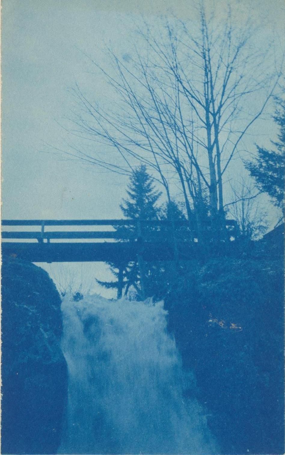 Photograph. Cyan-blue print. Looking up at footbridge across lower falls of Deschutes River.