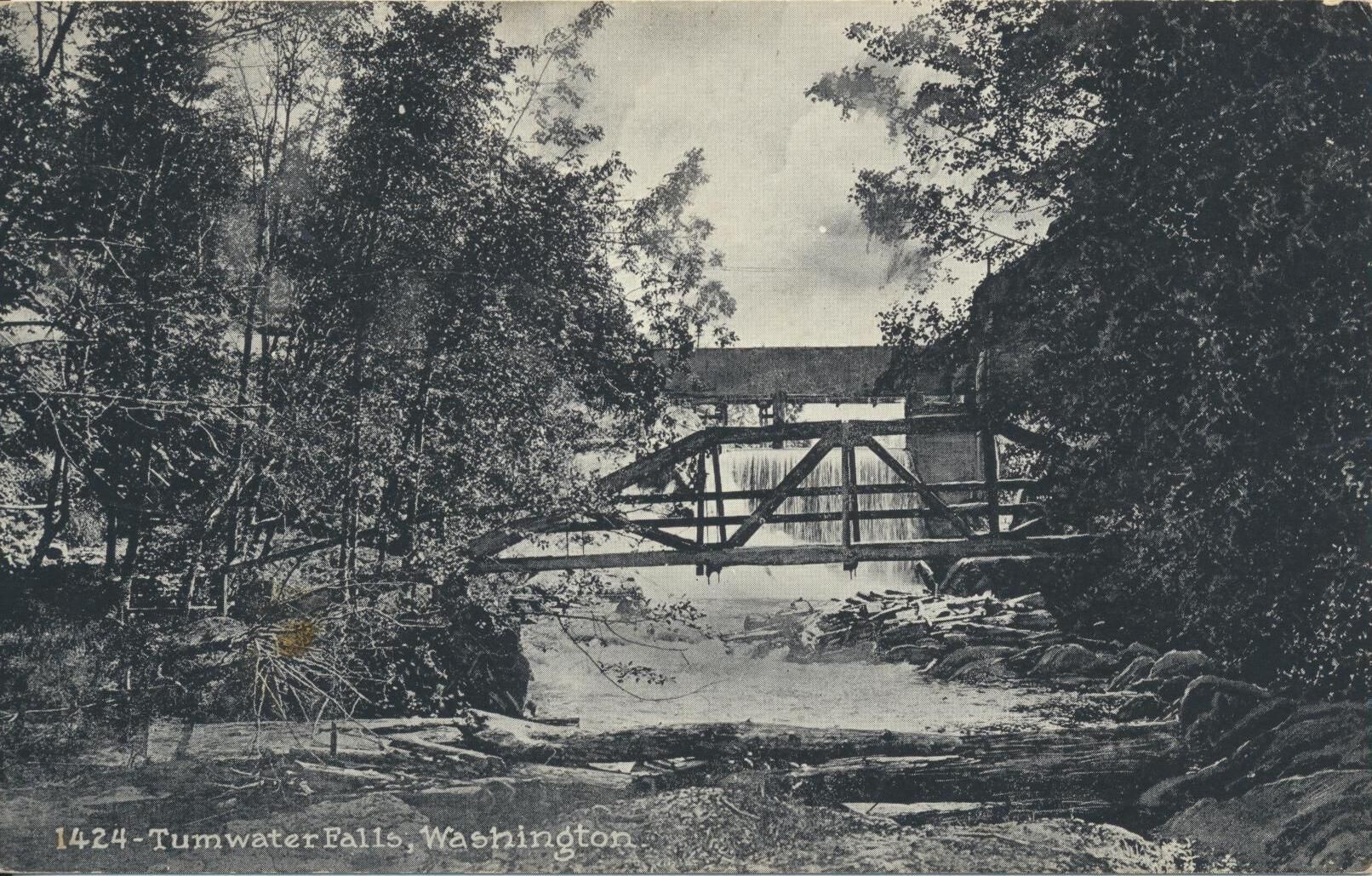 Postcard. View of middle falls of Deschutes River. Shows footbridge across river; dam and power house #1 in background.