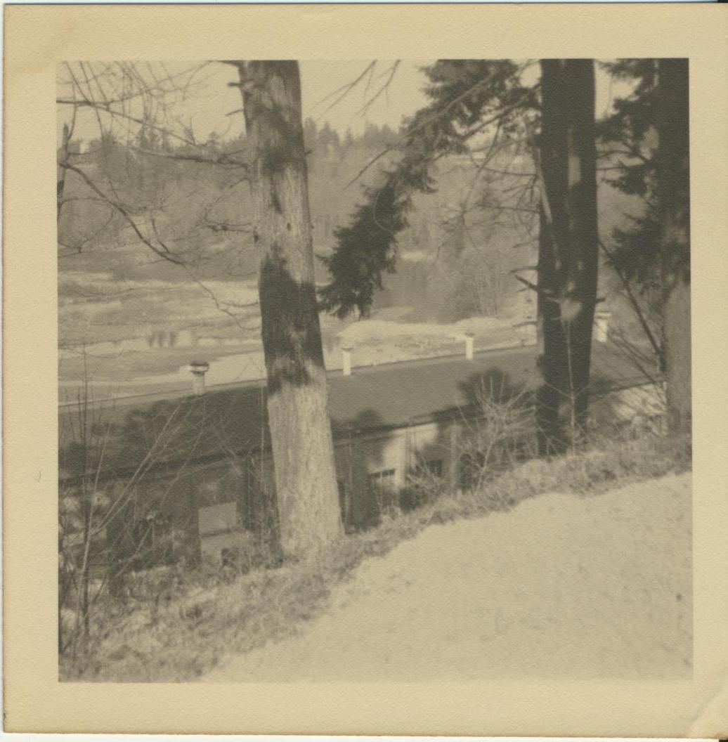 Photograph. View from hillside above Olympia brewery site, looking down onto roof and south side of paper mill building.