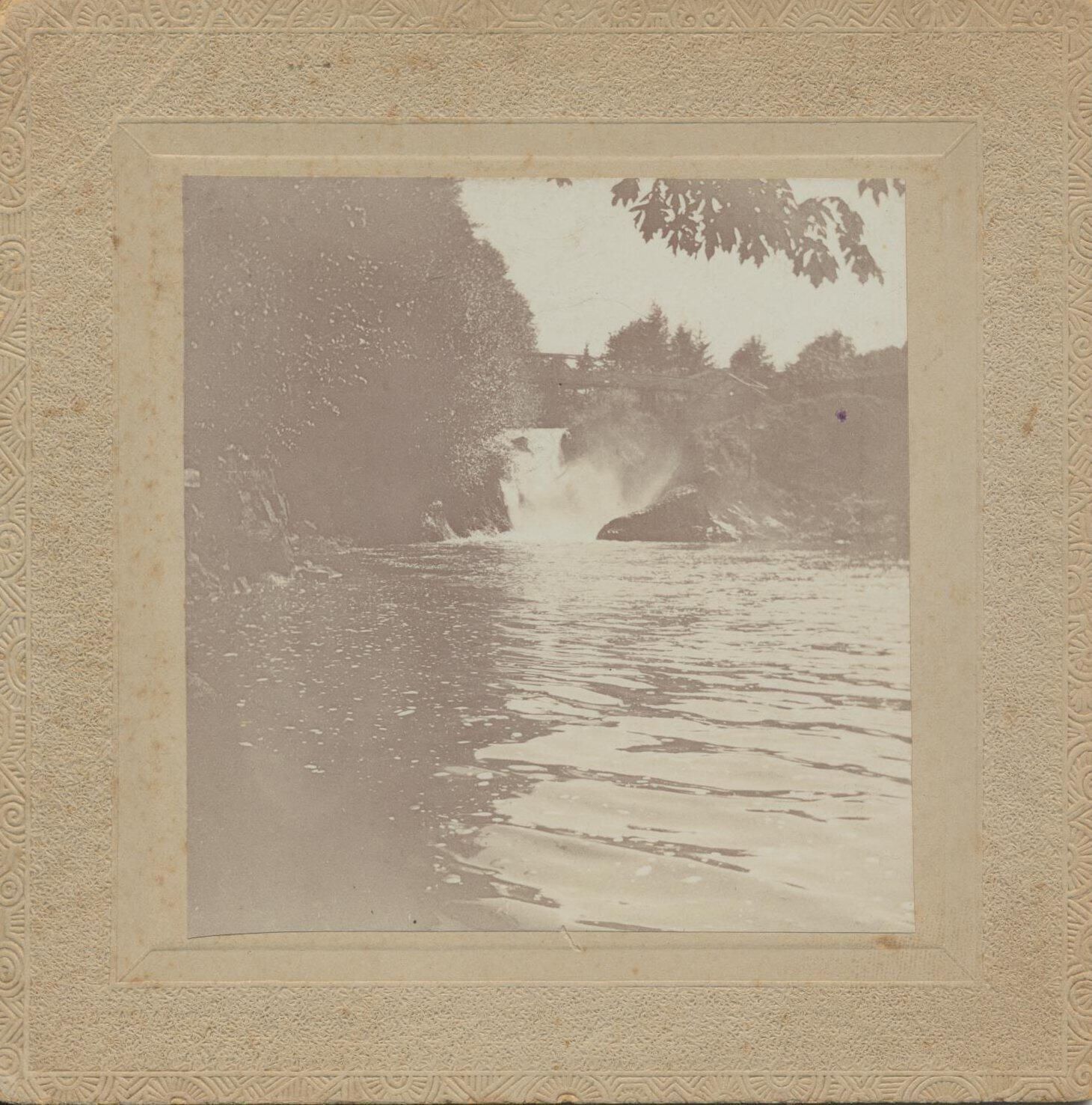 Photograph. Lower falls and footbridge on Deschutes River.