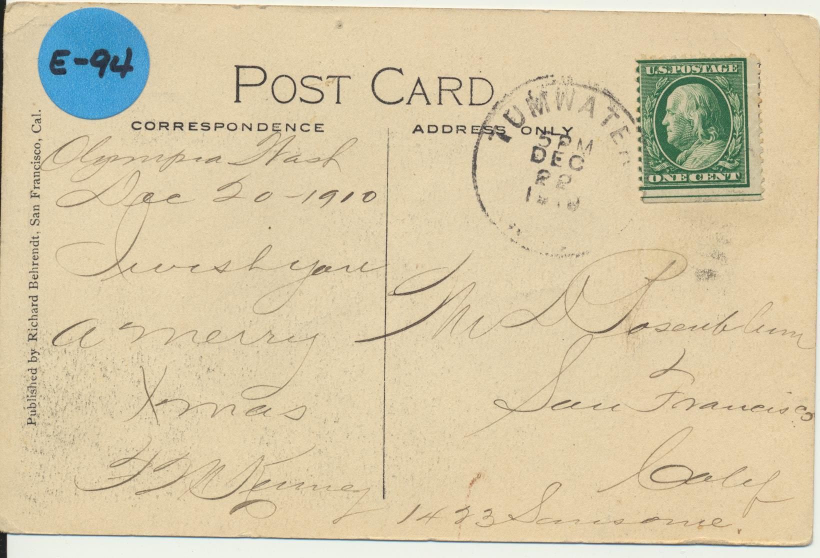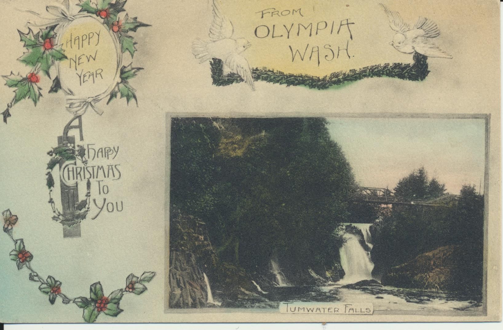 Postcard. Merry Christmas/Happy New Year postcard, postmarked 1910, from Frank M. Kenney to Mr. Rosenblum, San Francisco CA. Photo on postcard is lower falls and footbridge over Tumwater Falls.Other Names and Numbers