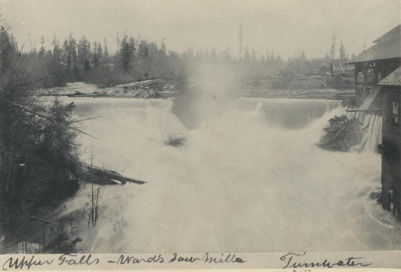 Photograph. View of upper falls of Deschutes River; high water. Ward and Hays sawmill at upper right; Ward and Hays grist mill at center right.Other Names and Numbers