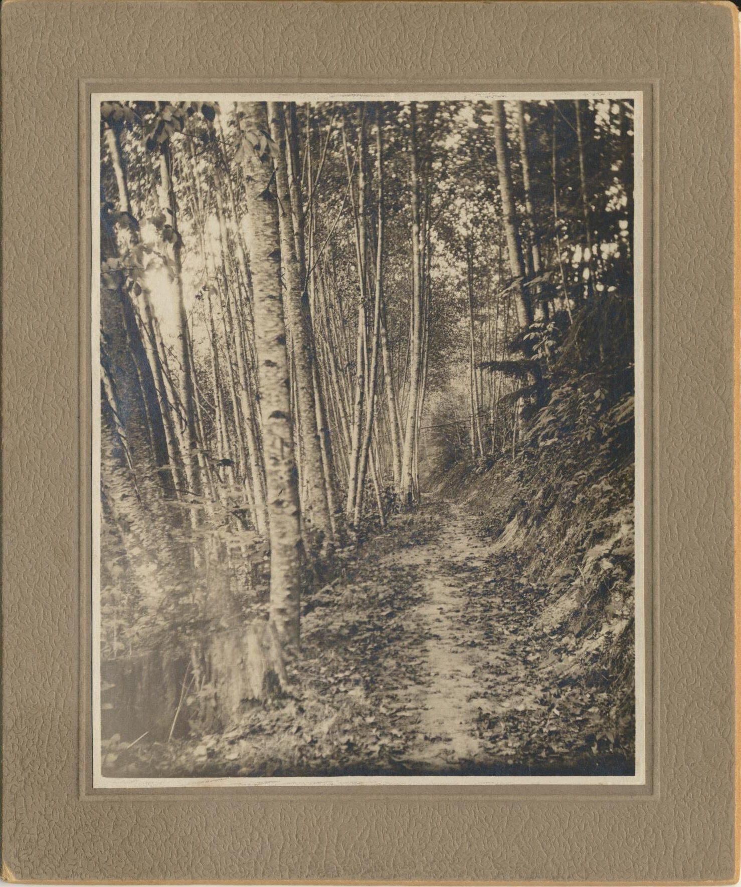 Photograph. Trail along Deschutes River between upper and lower falls.