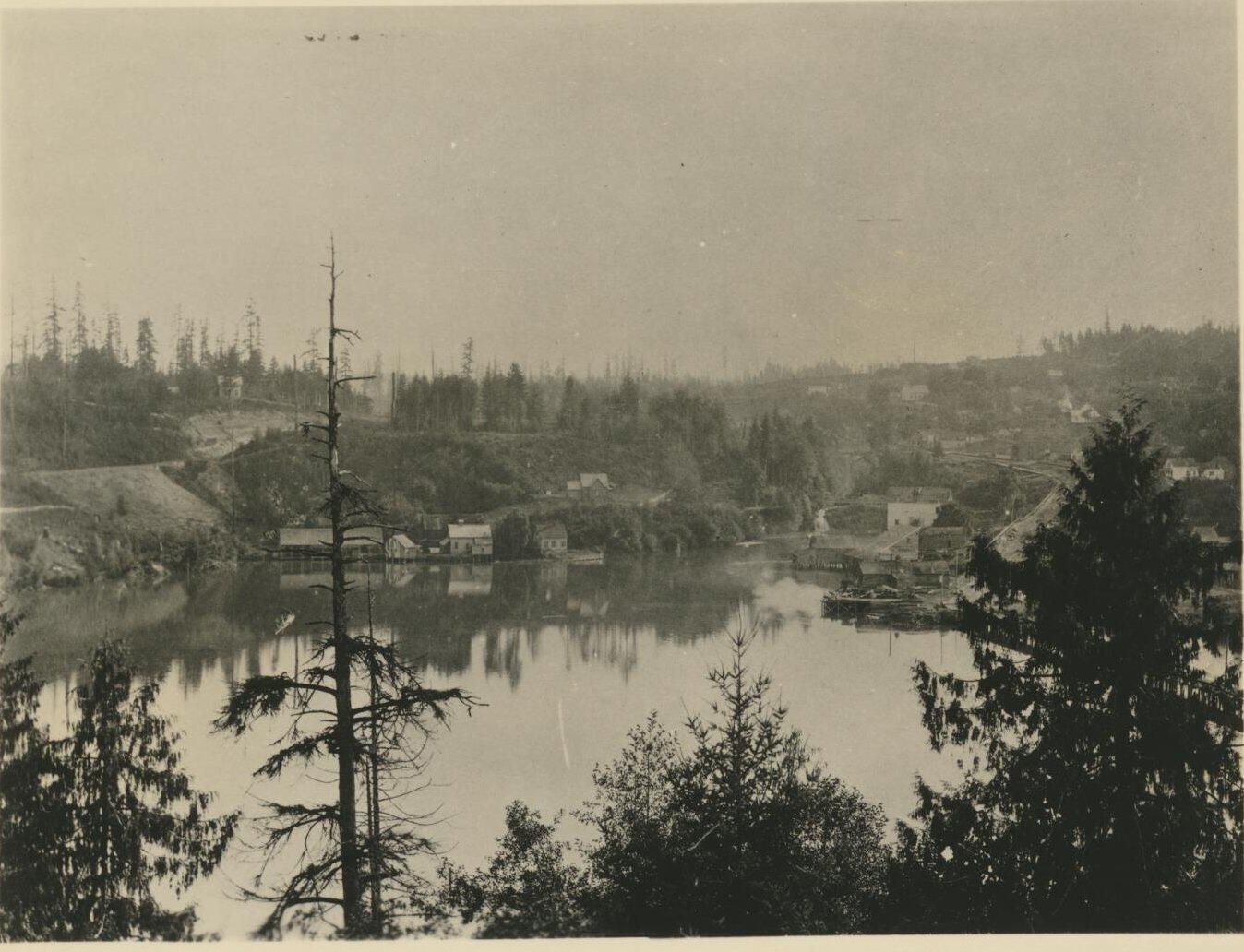 Photograph. Upper reaches of Puget Sound at Tumwater, showing Carter and Biles tannery property, which was in 1895 purchased by Leopold F. Schmidt for brewery.