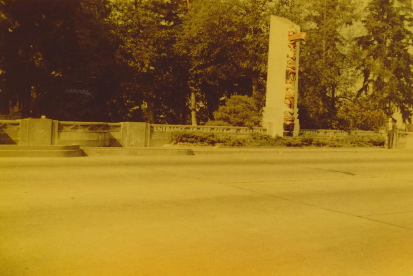 Photograph. Carlyon Bridge, part of Highway 99, through Tumwater, linking Portland OR and Seattle WA. The bridge was completed in 1938 and has decorative cast-concrete totem poles at each end. The poles were originally plain concrete, but Peter G. Schmidt Sr. later had them painted in bright colors. No ID on man.Name/Title