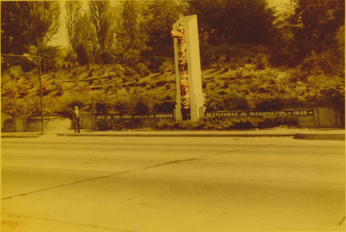 Photograph. Carlyon Bridge, part of Highway 99, through Tumwater, linking Portland OR and Seattle WA. The bridge was completed in 1938 and has decorative cast-concrete totem poles at each end. The poles were originally plain concrete, but Peter G. Schmidt Sr. later had them painted in bright colors. No ID on man.Name/Title