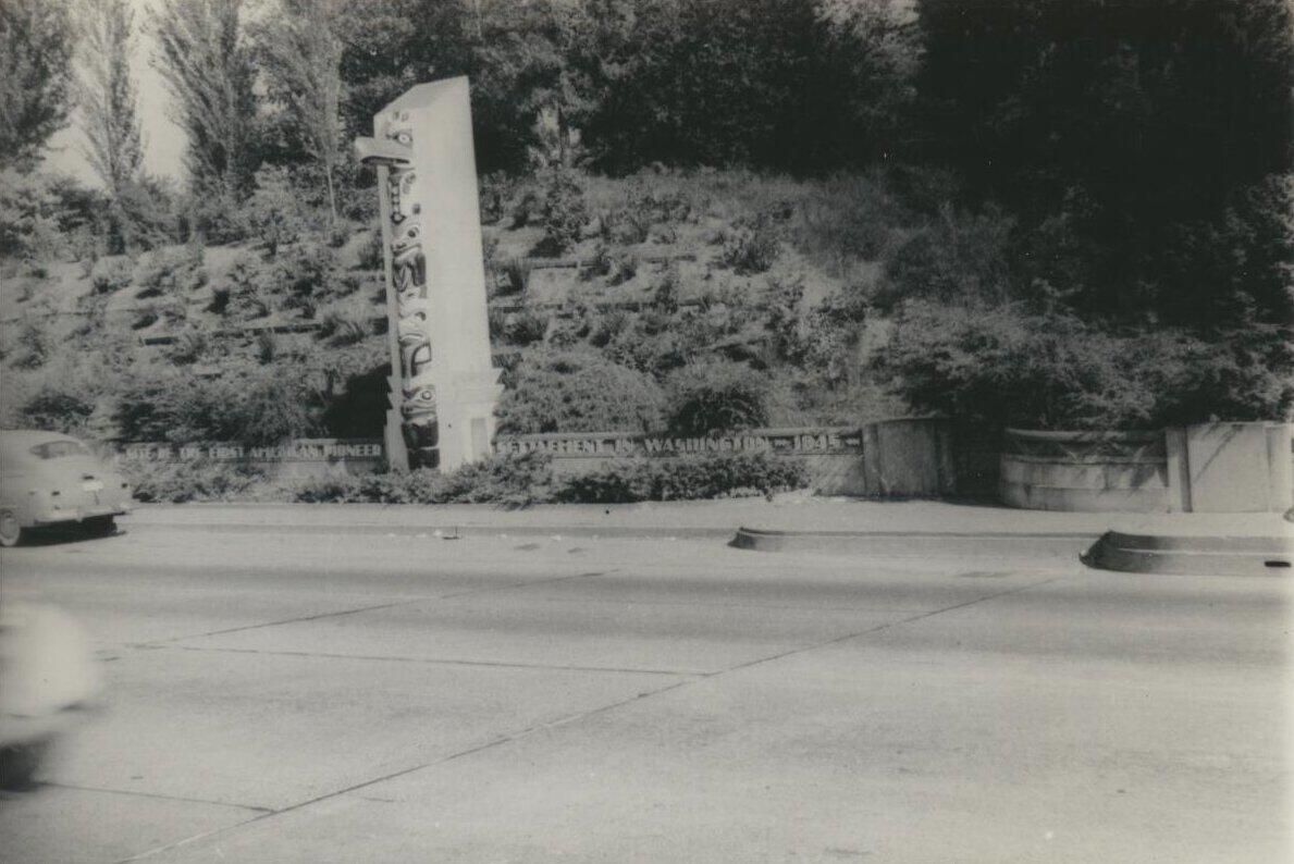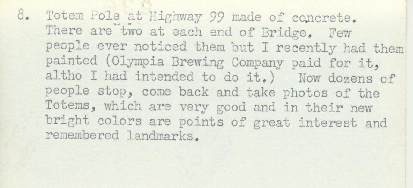 Typed on back of photo: "Totem pole at Highway 99 made of concrete. There are two at each end of Bridge. Few people ever noticed them but I recently had them painted (Olympia Brewing Company paid for it, altho I had intended to do it.) Now dozens of people stop, come back and take photos of the Totems which are very good and in their new bright colors are points of great interest and remembered landmarks."Name/Title
