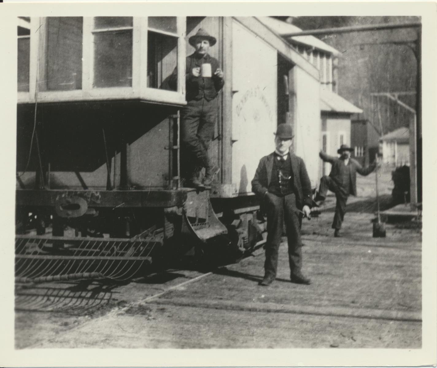 Photograph. Streetcar. Olympia Light and Power Company trolley came to Olympia brewery, transported beer to bottling department on Water Street in Olympia and to docks in Olympia. View shows trolley at brewery, looking east. Motorman on trolley is "Shorty." Man in derby hat is "Duke" who ran the brewery's hospitality room. In background is Fred Brey, brewery yardman.Name/Title