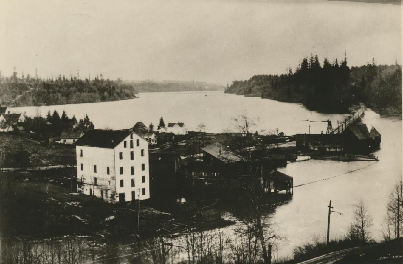 Photograph. Mill area of old Tumwater, now Tumwater Historical Park. Large white building is Crosby's Lincoln Flour Mill, which burned down in 1905. Long bridge to Olympia is visible at right.