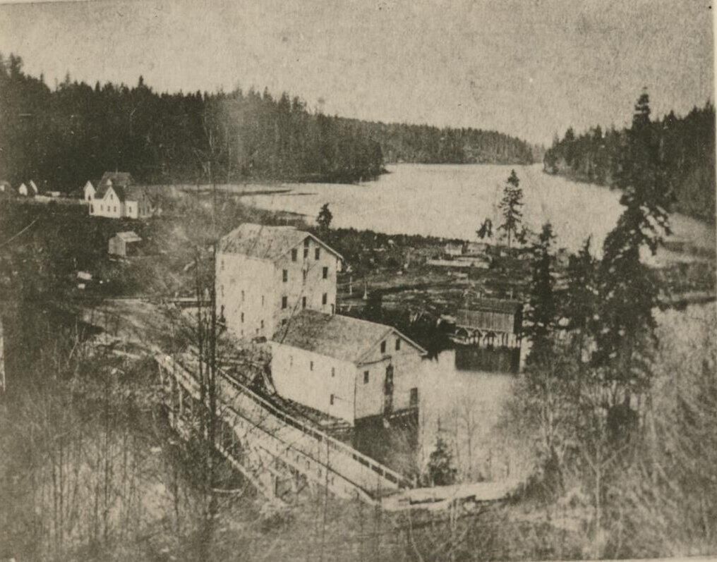 Photograph. Mill area of old Tumwater, now Tumwater Historical Park. Large white building is Crosby's Lincoln Flour Mill, which burned down in 1905.Other Names and Numbers