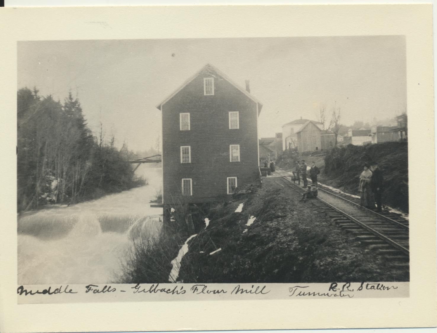 Photograph. Gelbach's mill, winter 1879, at middle falls of Deschutes River. Passengers wait for train to Tenino. Narrow-gauge tracks shown; replaced with standard-gauge tracks in 1890.