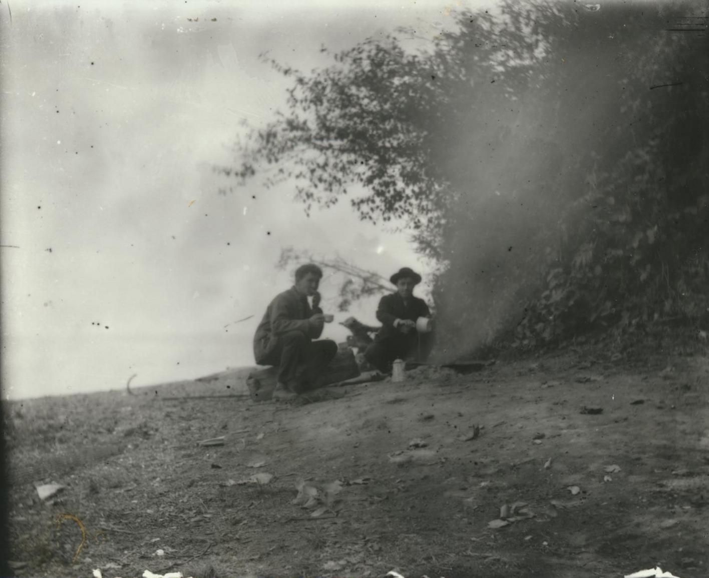 Photograph. Young men with campfire on beach, unknown location, probably in Olympia area. Adolph Schmidt on left; no ID on other.