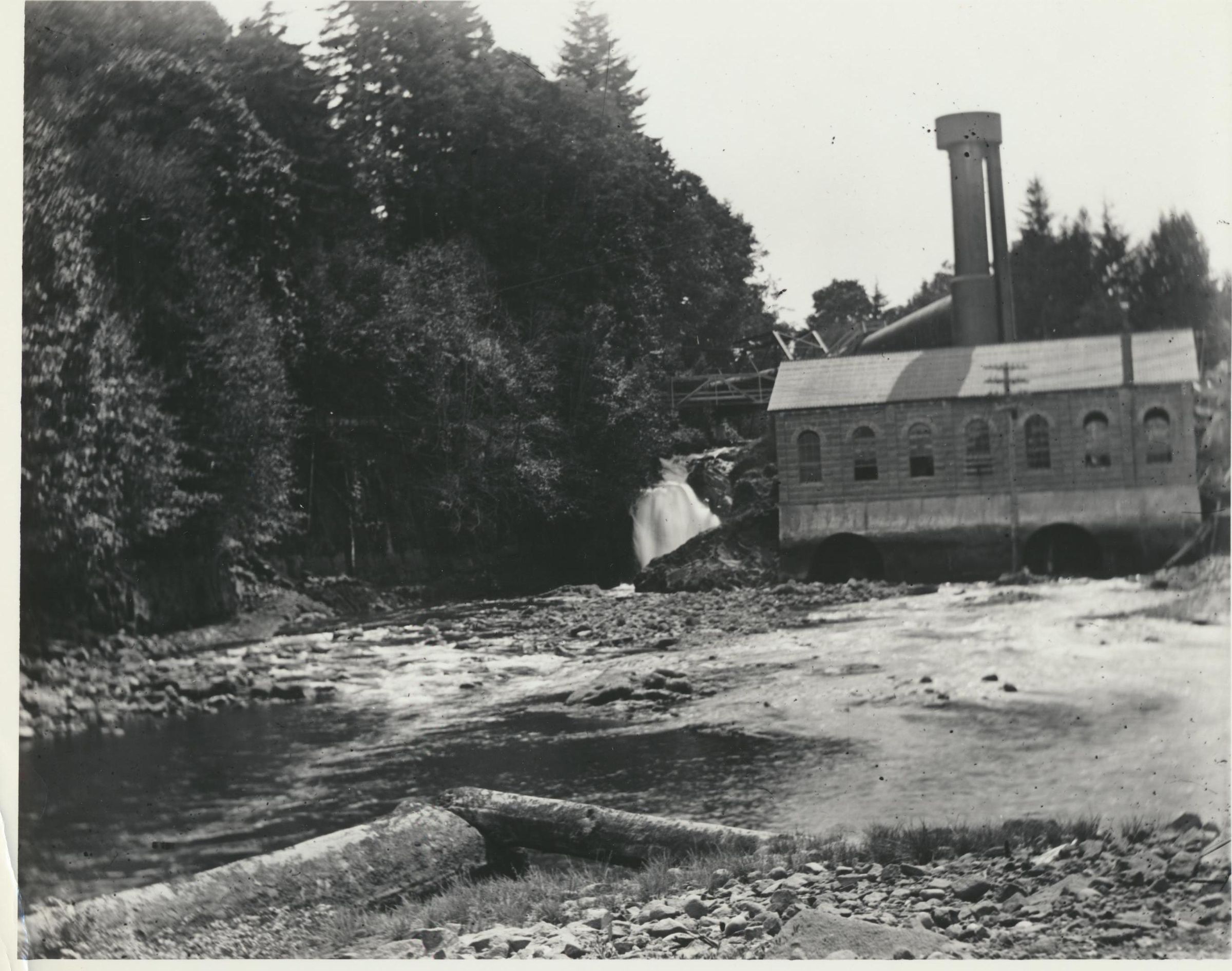 Photograph. #2 power house of Olympia Light and Power, built at lower falls on Deschutes River.