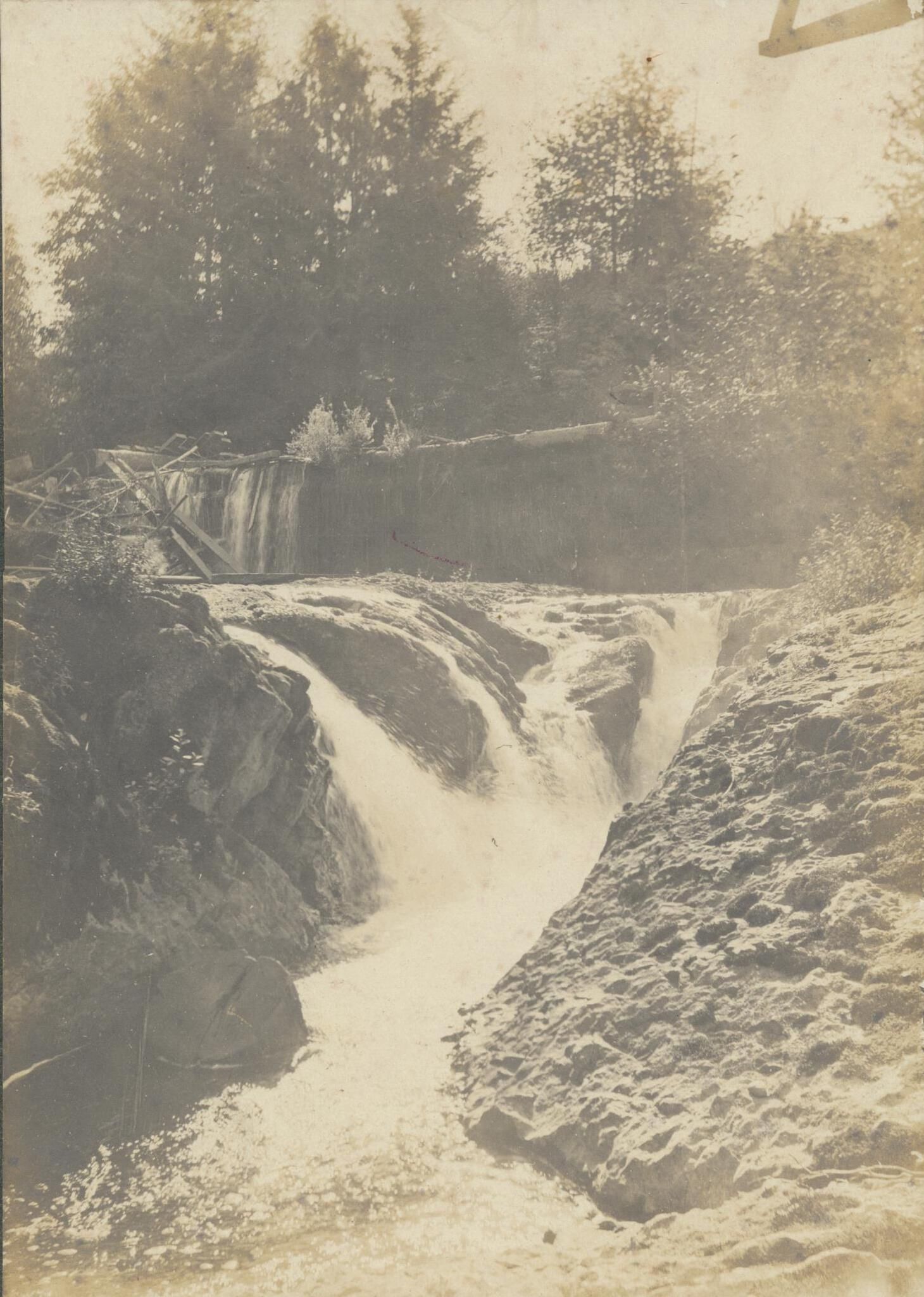Photograph. Falls of Deschutes River, immediately above footbridge over lower Tumwater Falls. Noted as "property of Fritz A. Schmidt, Olympia"