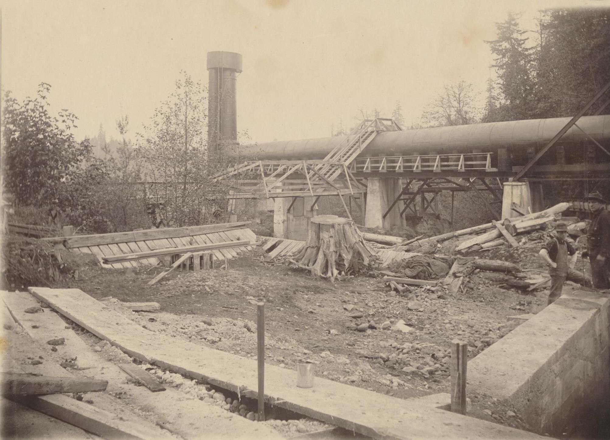 Photograph. Construction site on west bank of Deschutes River, above lower falls. Shows penstock and standpipe at #2 power house for Olympia Light and Power. No ID on men. Photo taken by Frank Kenney, November 2, 1905. Reproduced or mounted by Ida B. Smith, Olympia studio.Name/Title