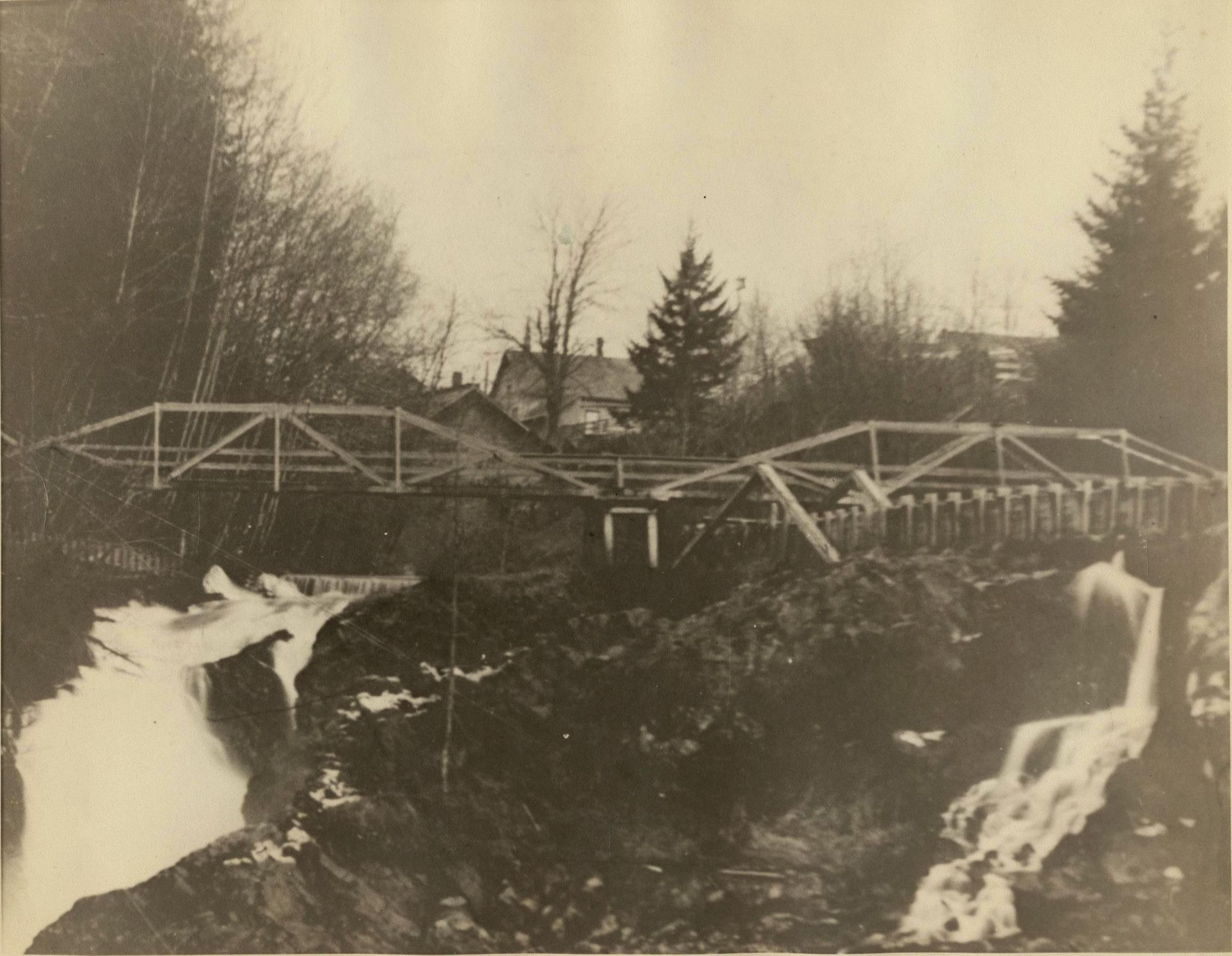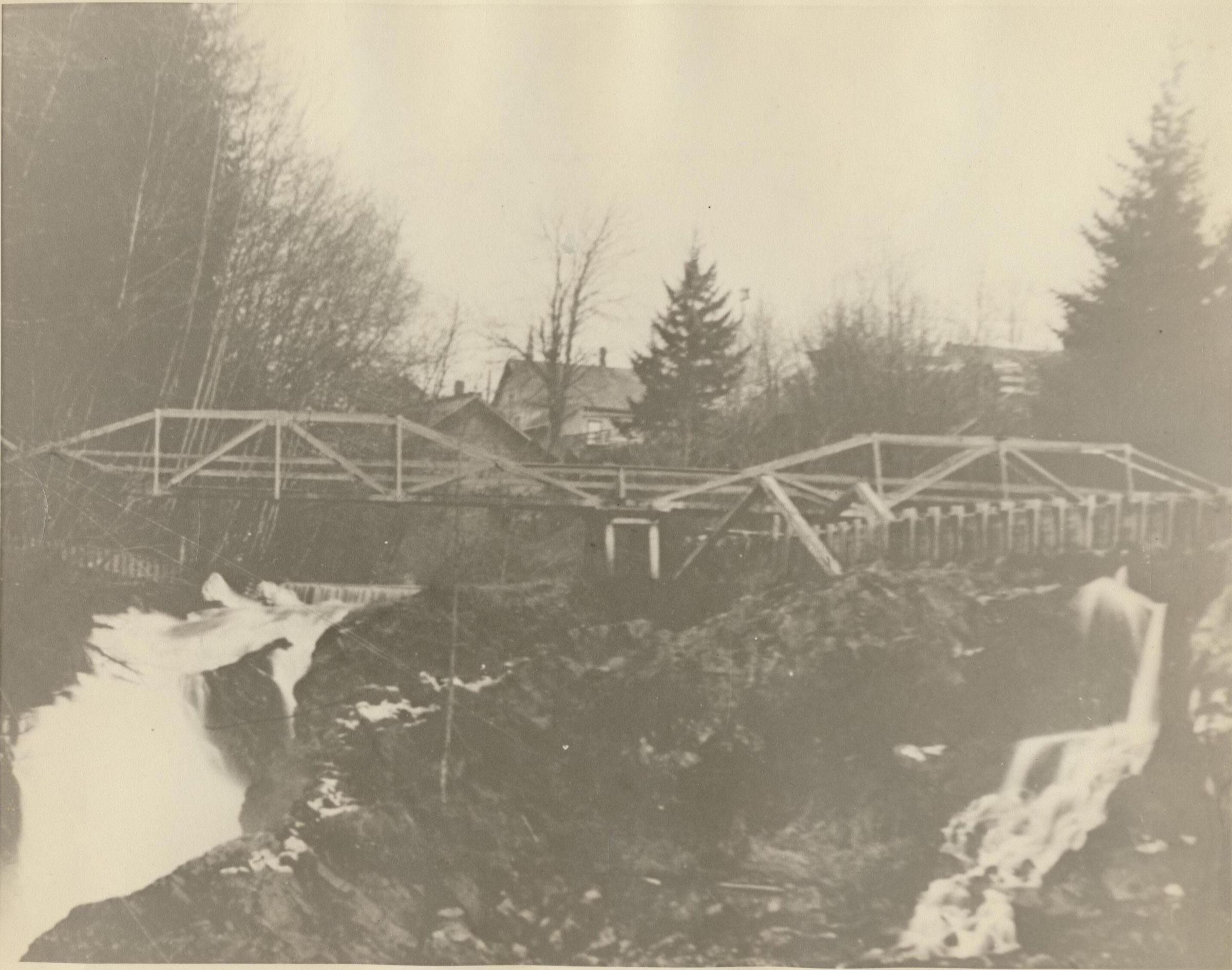 Photograph. Lower falls of Deschutes River, showing footbridge across falls and old wooden flume to mills below.