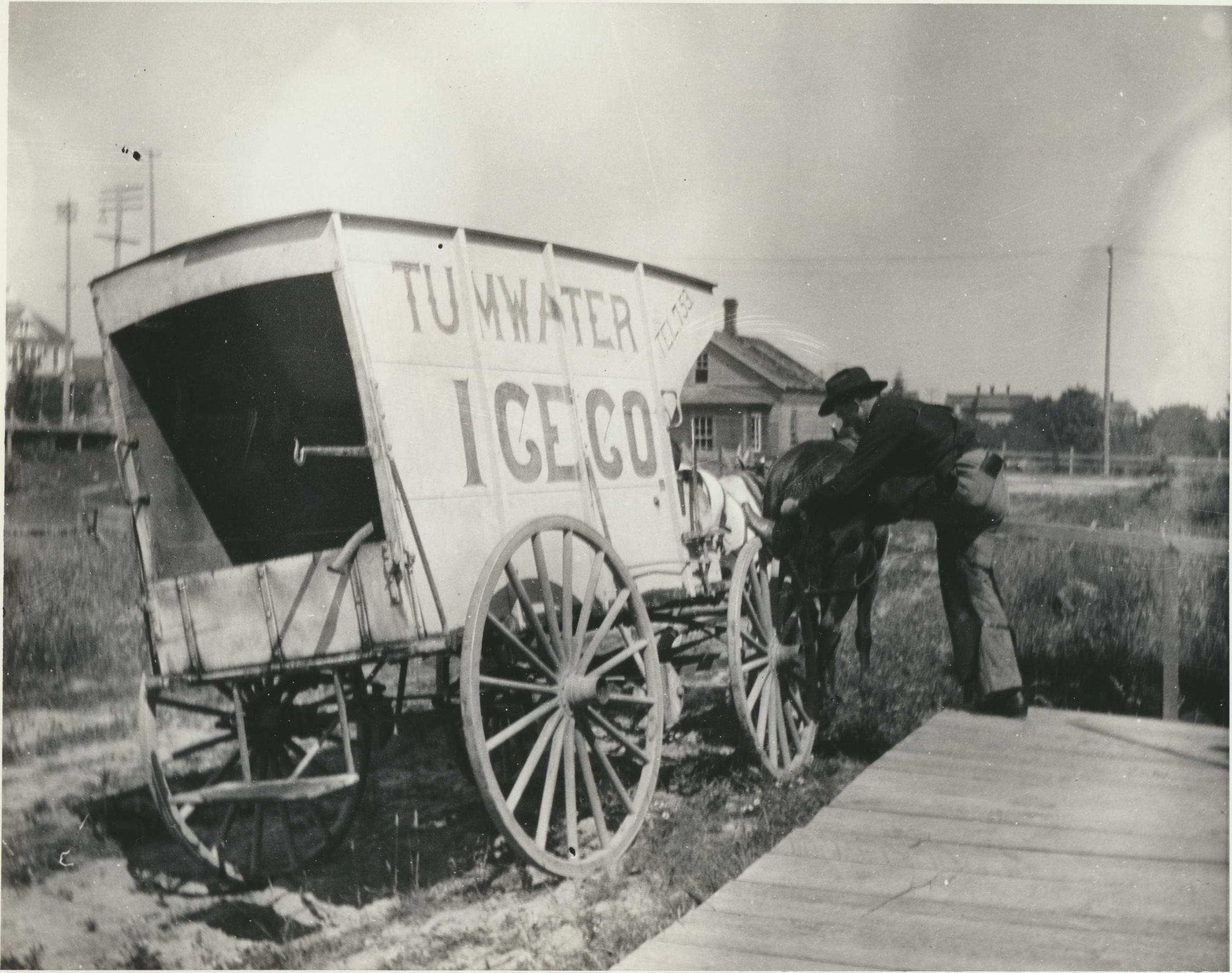 Photograph. Delivery wagon of Tumwater Ice Company. No ID on man.