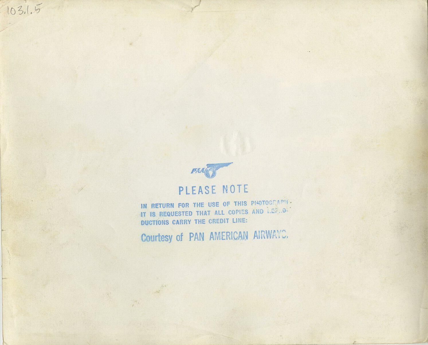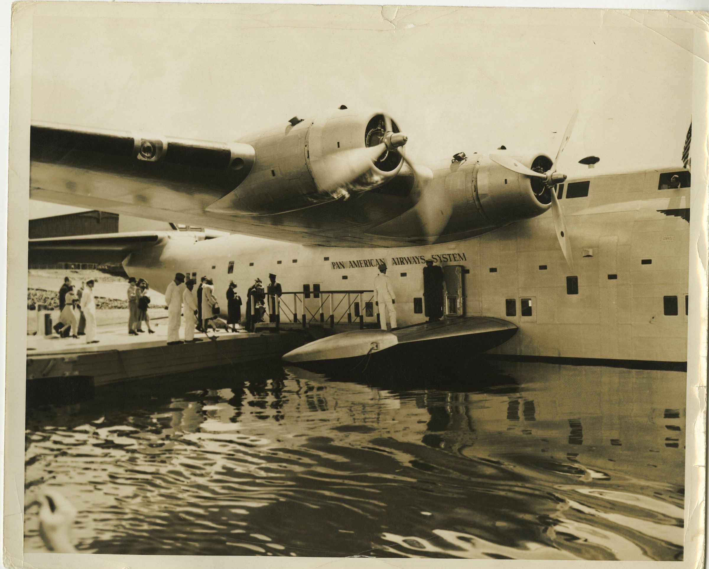 Photo, 8 x 10 sepia. Pan American Atlantic Clipper plane, loading passengers, probably at New York.