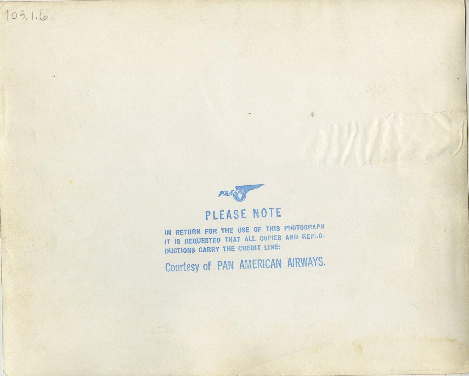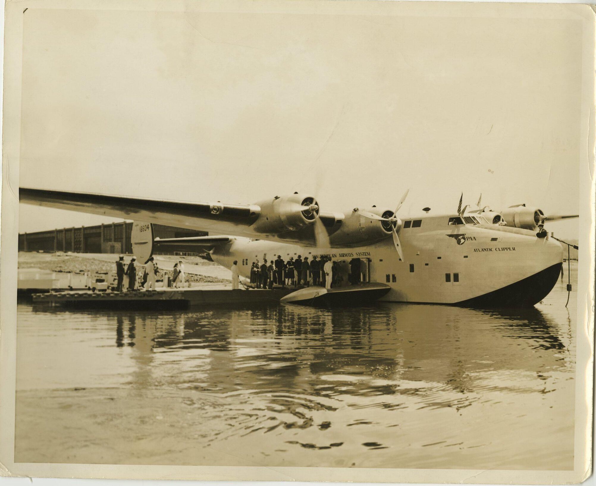 Photo, 8 x 10 sepia. Pan American Atlantic Clipper plane, loading passengers, probably at New York.