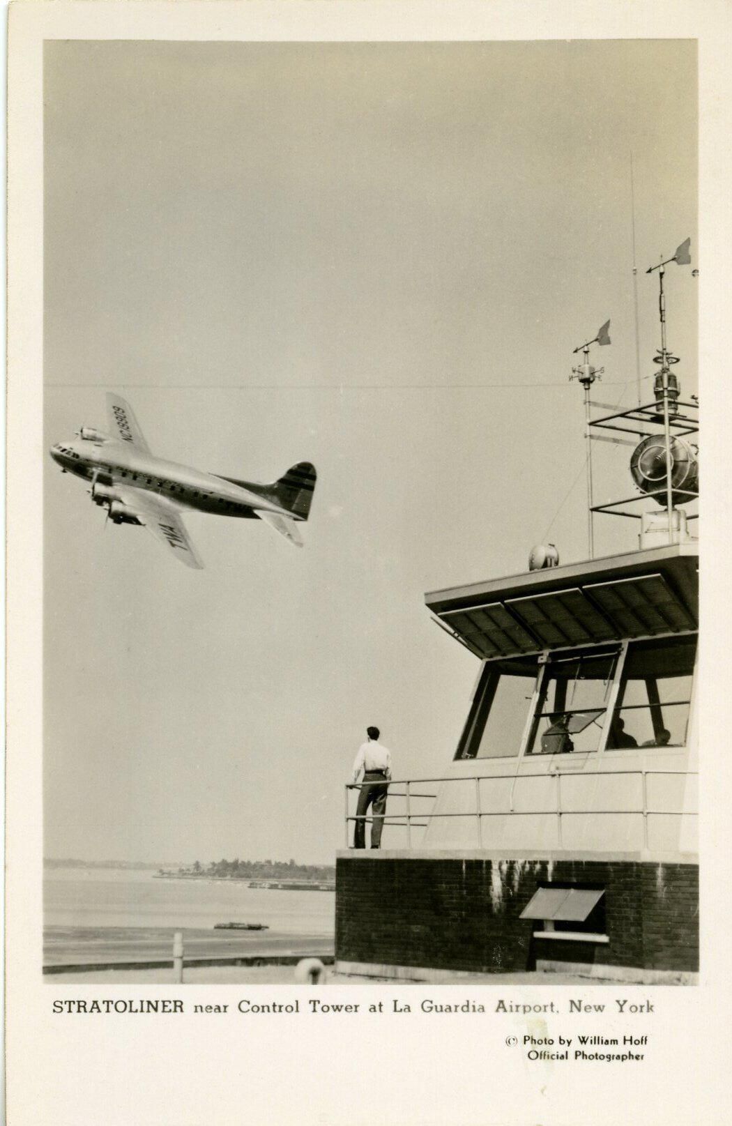 Postcard, picture, real photo. 5 1/2 x 3 1/2 b&w. Stratoliner near control tower at La Guardia Airport, NY.