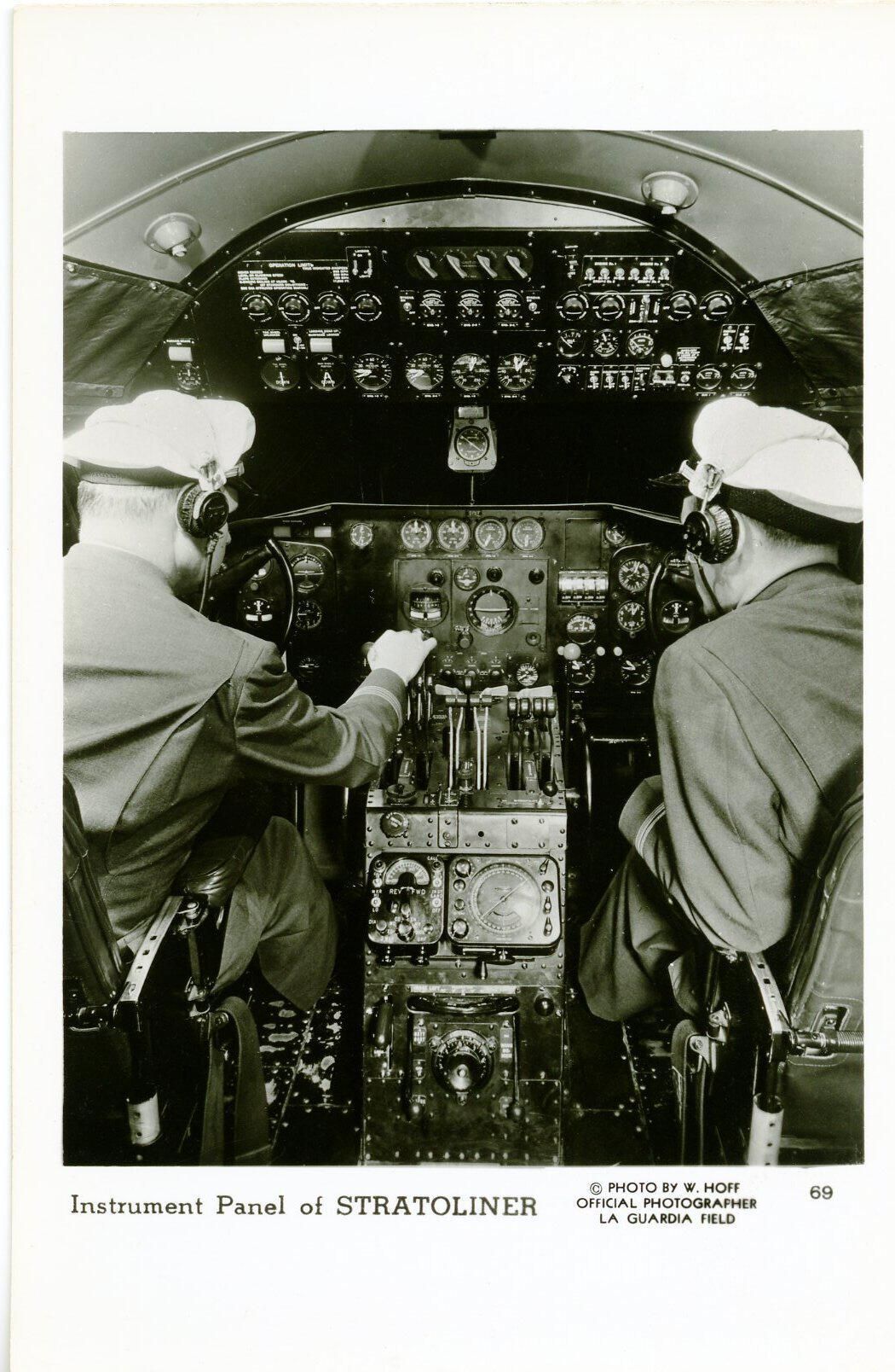 Postcard, picture, real photo. 5 1/2 x 3 1/2 b&w. Two pilots shown at instrument panel of Stratoliner plane.