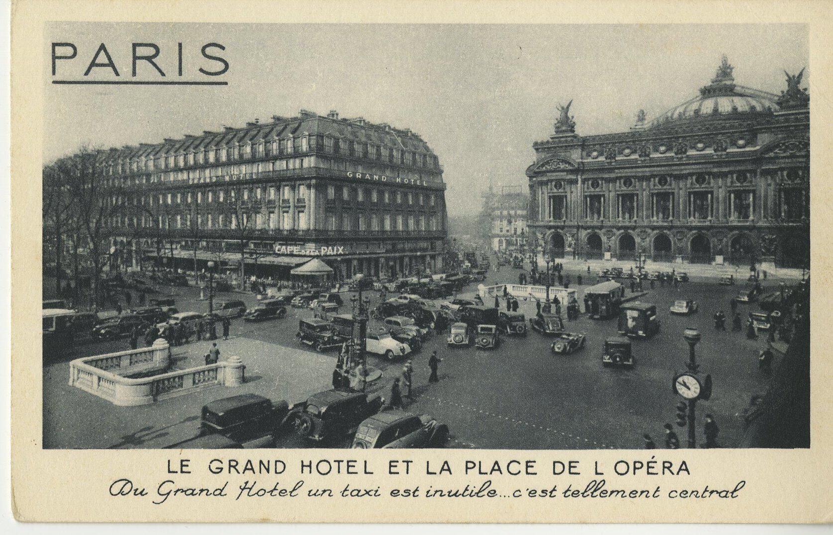 Postcard, picture, real photo. 5 1/2 x 3 1/2 b&w. View of Le Grand Hotel and Opera House in Paris, France, with street scene in foreground.