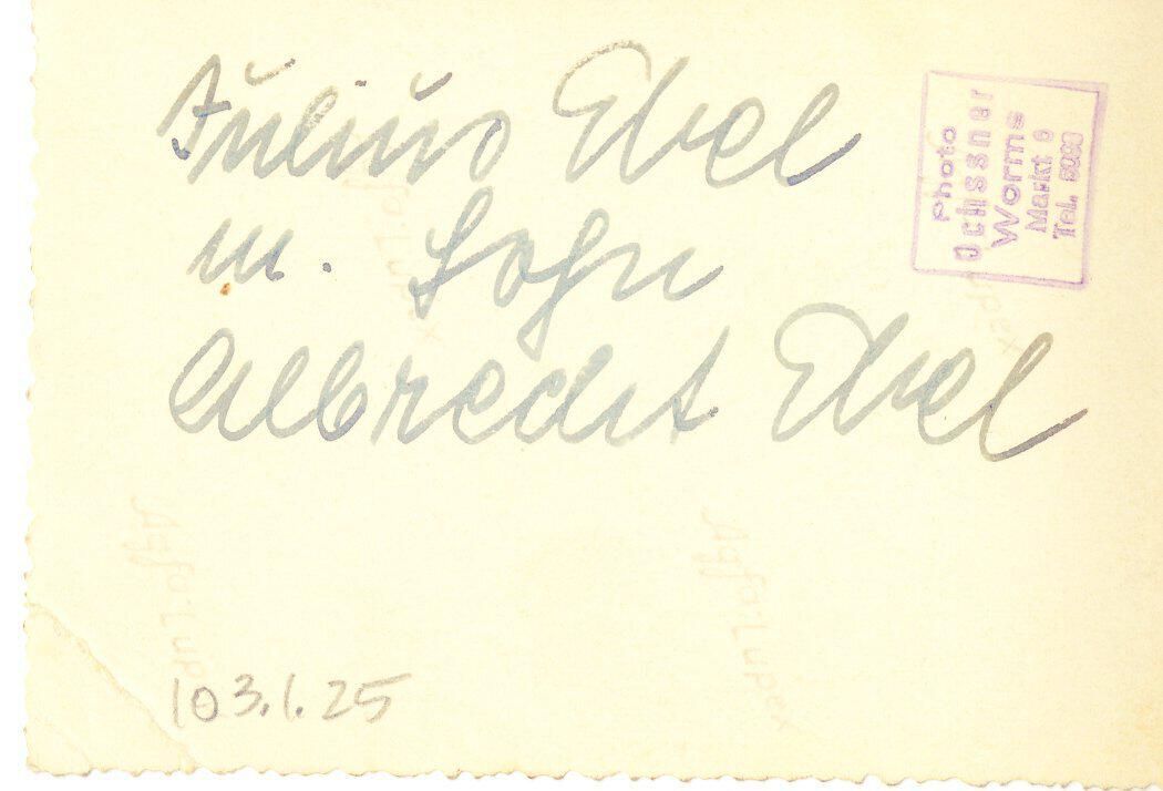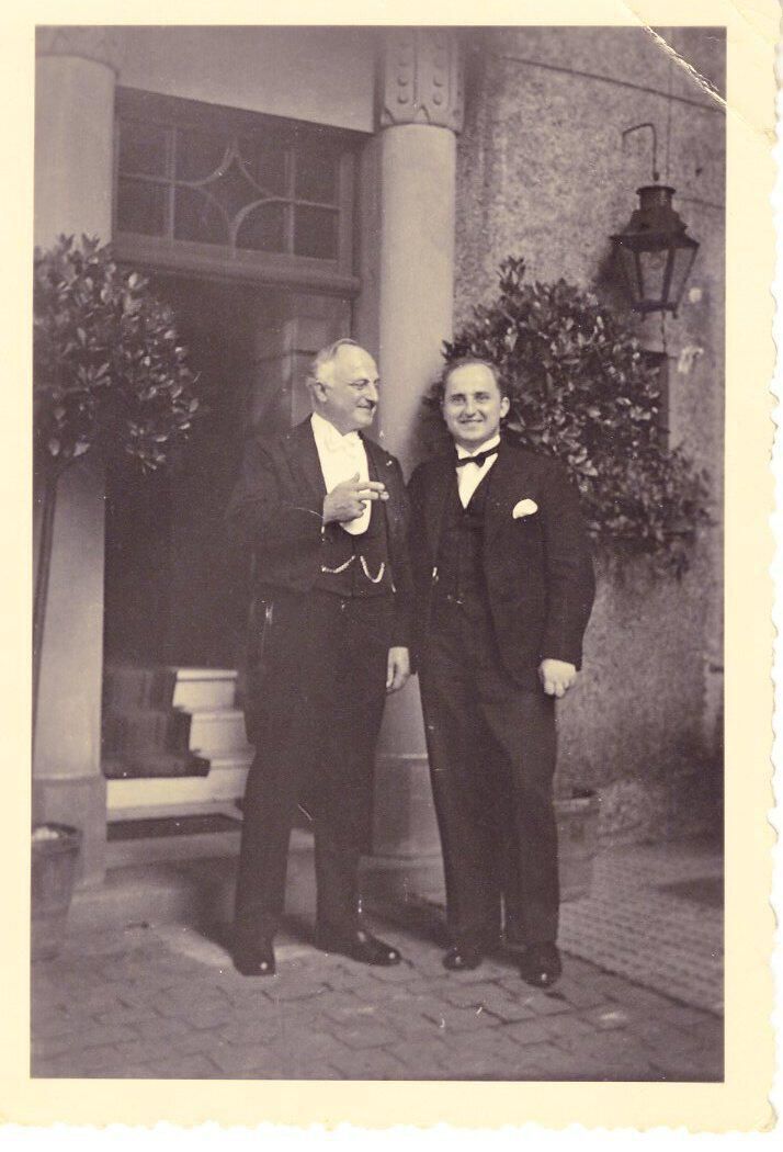 Print, photographic. 2 1/2 x 3 1/2 b&w. Two men, one old, one young. One may be Albrecht Ebel, a cousin of Peter G. Schmidt Sr.