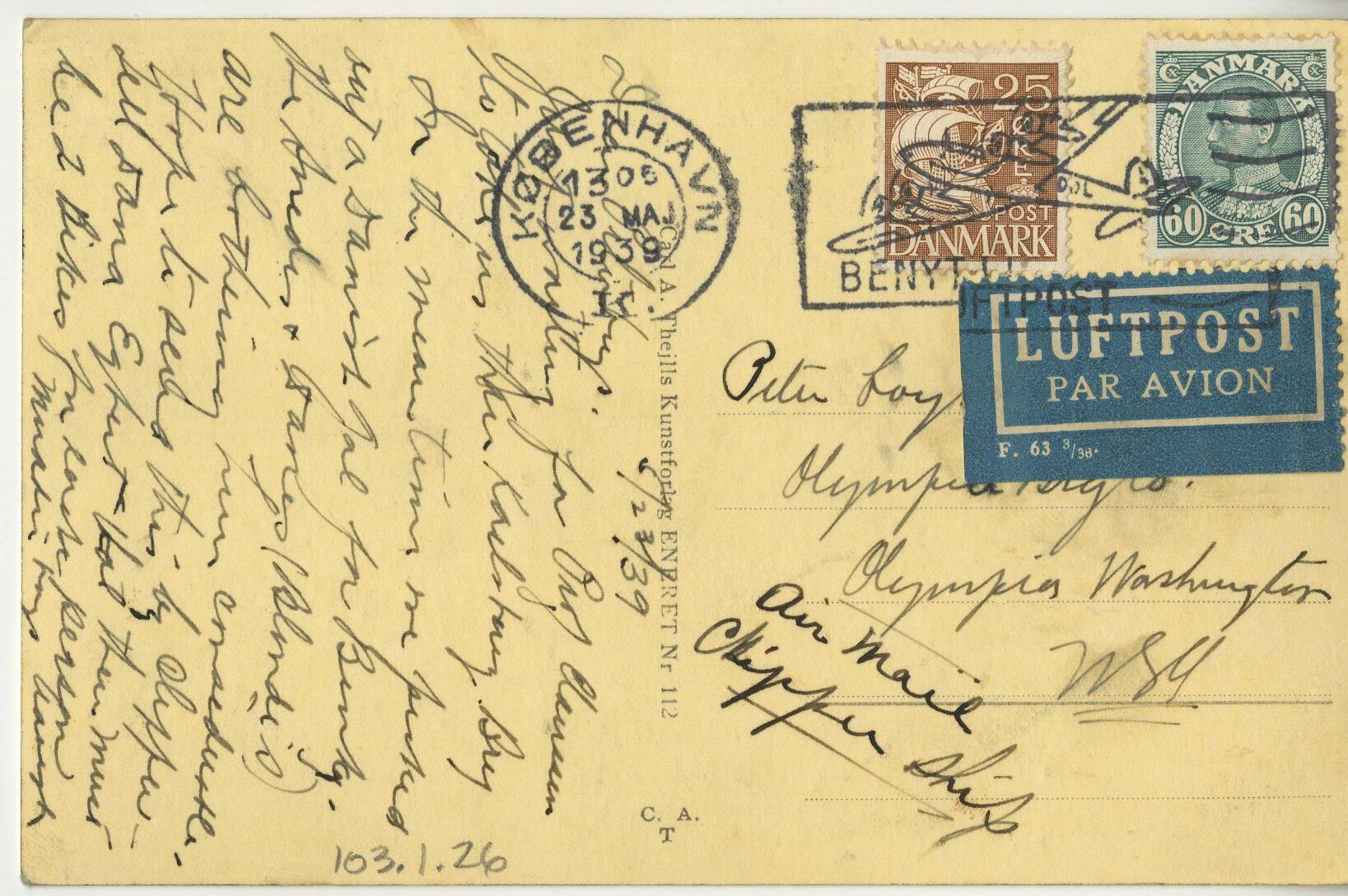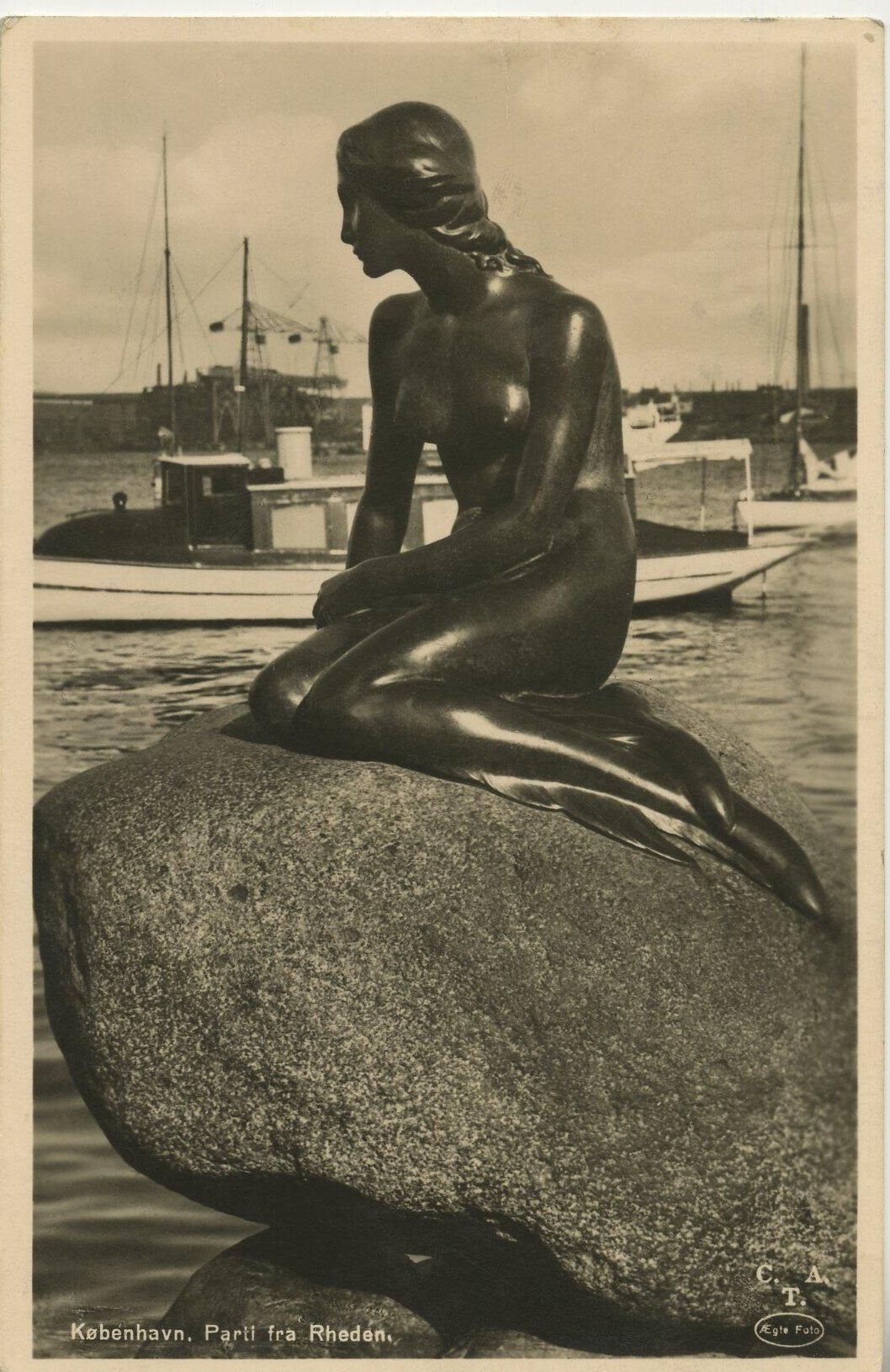 Postcard, picture, real photo. 3 1/2 x 5 1/2 b&w. Statue of Little Mermaid on rock in Copenhagen, Denmark. Postcard was sent by Adolph Schmidt to Peter Schmidt via air mail, "Clipper Ship," dated May 22, 1939, postmarked May 23, 1939. Message reads: "Dear Peterboy. Just waiting for Prof. Claussen to take us thru Karlsburg Brwy. In the meantime we picked out a Danish gal for Bink. The Swedes & Danes (blondes) are bothering him considerable. Hope to send this by Clipper. Tell Dana Egbert that there must be 2 bikes for each person [two indecipherable words]. Adolph."Name/Title