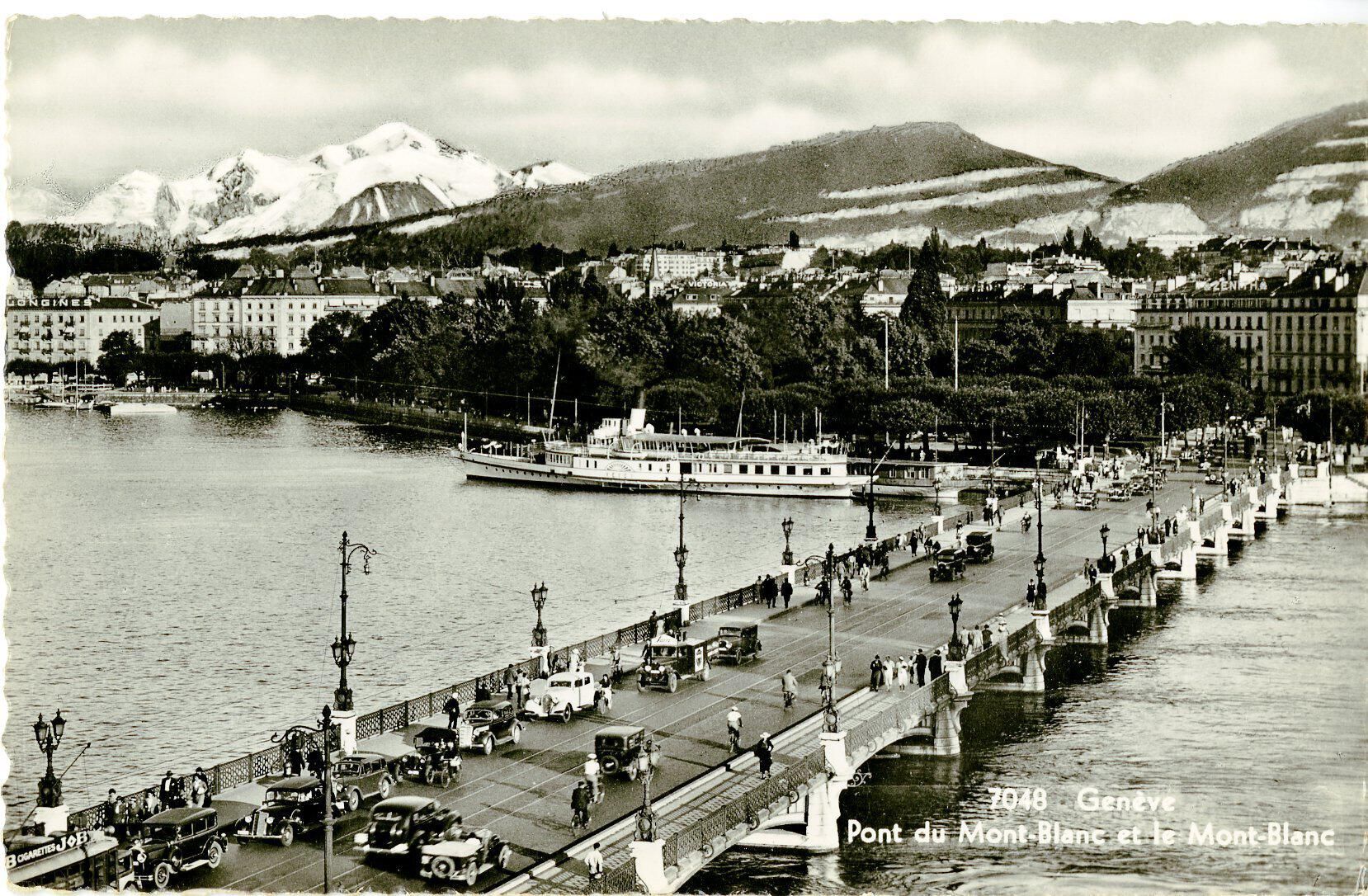Postcard, picture, real photo. 3 1/2 x 5 1/2 b&w. Pont du Mont-Blanc (bridge) in Geneva, Switzerland.
