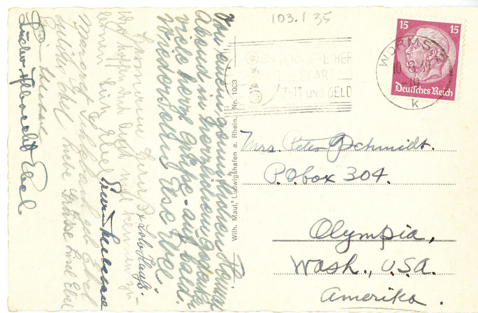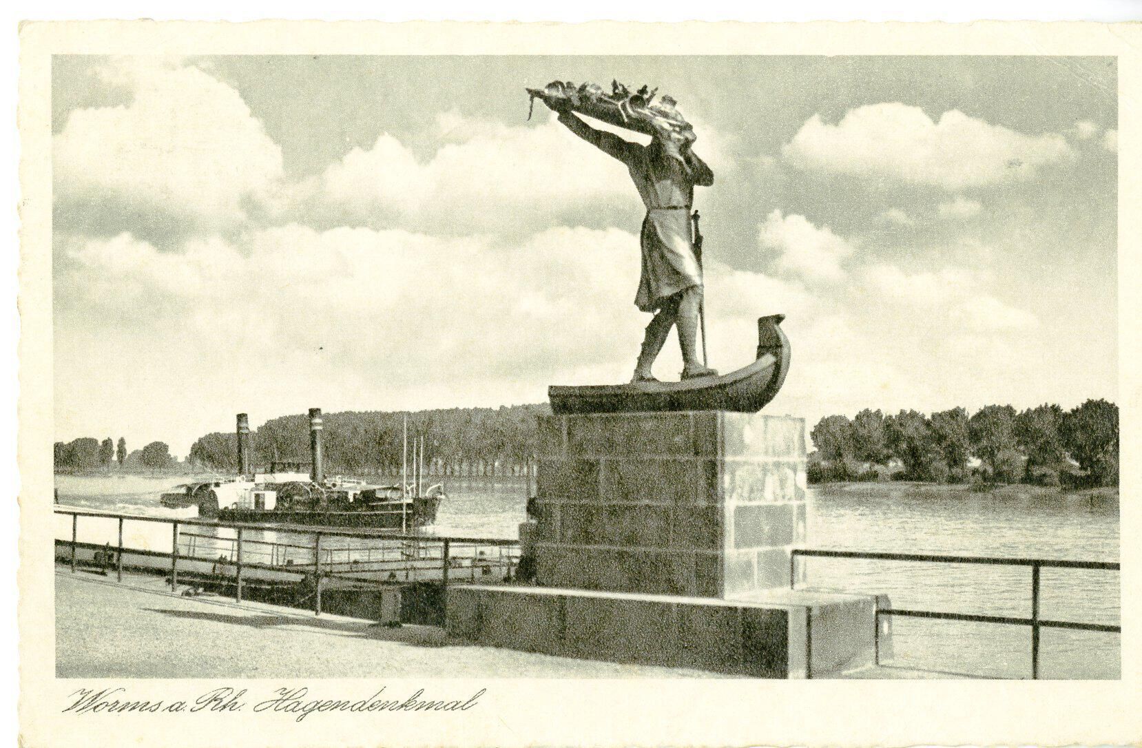 Postcard, picture, real photo. 3 1/2 x 5 1/2 b&w. Hagen Monument in Worms, Germany. Sent to Clara Schmidt (Mrs. Peter) by Albrecht Ebel (Peter's cousin) and others. Message in German.