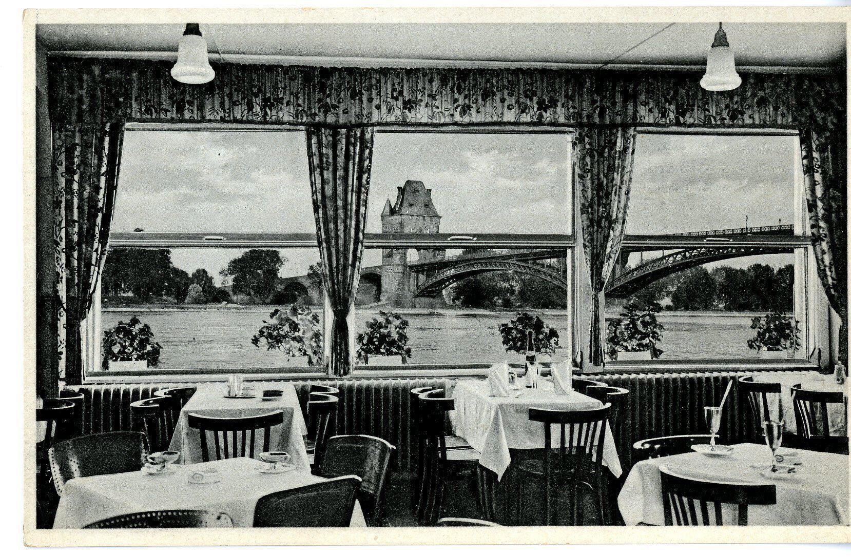 Postcard, picture, real photo. 3 1/2 x 5 1/2 b&w. View of Rhein River and Worms, Germany from dining room of restaurant/hotel. Rheinkaffee, Hotel Rest. Reinischer Hof.