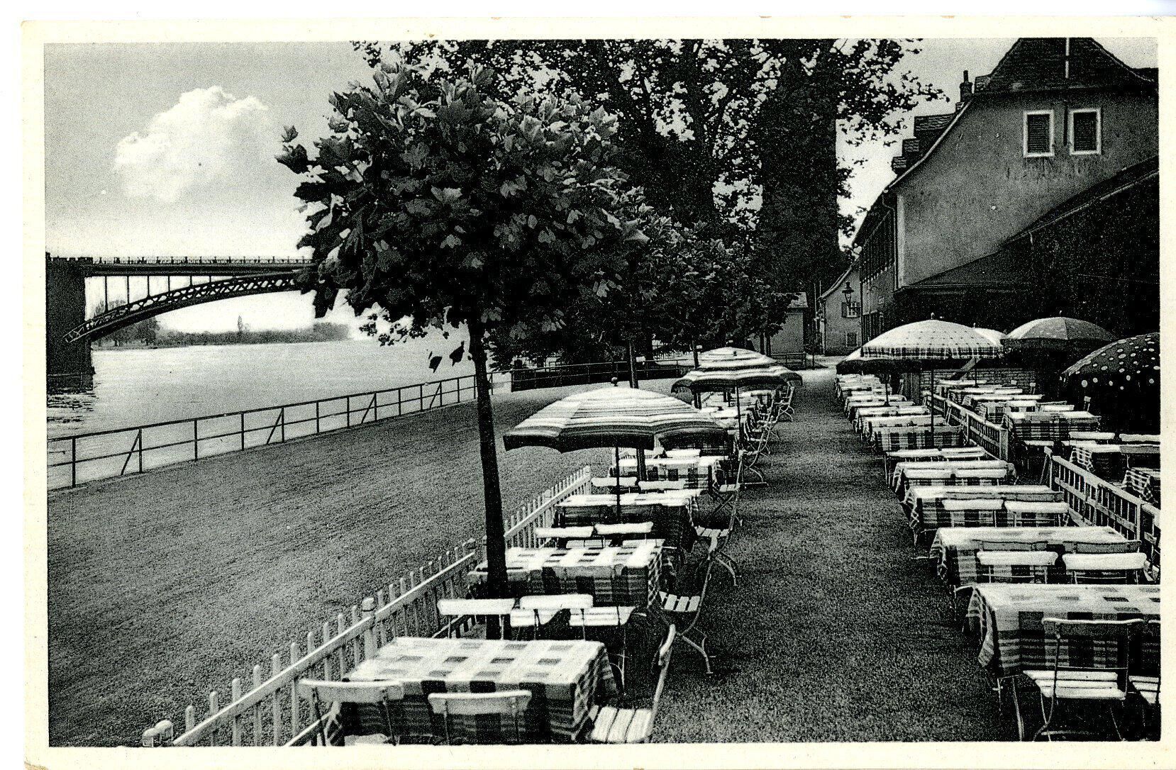 Postcard, picture, real photo. 3 1/2 x 5 1/2 b&w. View of Rhein River and Worms, Germany from outdoor dining area of restaurant/hotel. Rheinkaffee, Hotel Rest. Reinischer Hof.