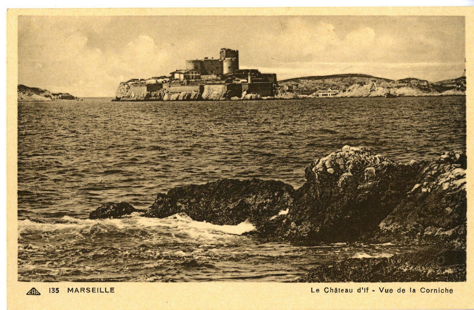 Postcard, picture, real photo. 3 1/2 x 5 1/2 sepia. View of seacoast, rocks, Marseille, Le Chateau d'if - Vue de la Corniche. The chateau served for a long time as a prison.