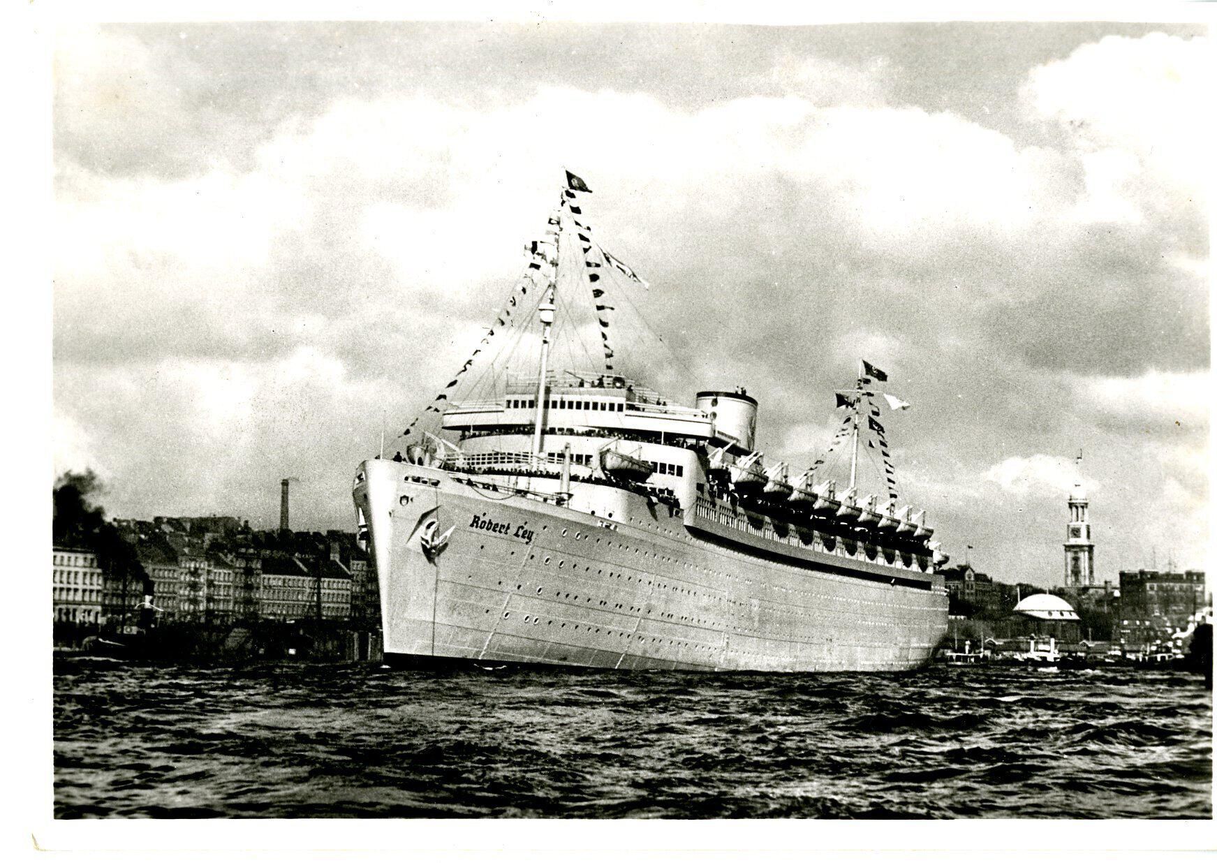 Postcard, picture, real photo. 5 3/4 x 4 b&w. View of "Robert Ley" ocean liner in harbor (probably Hamburg).