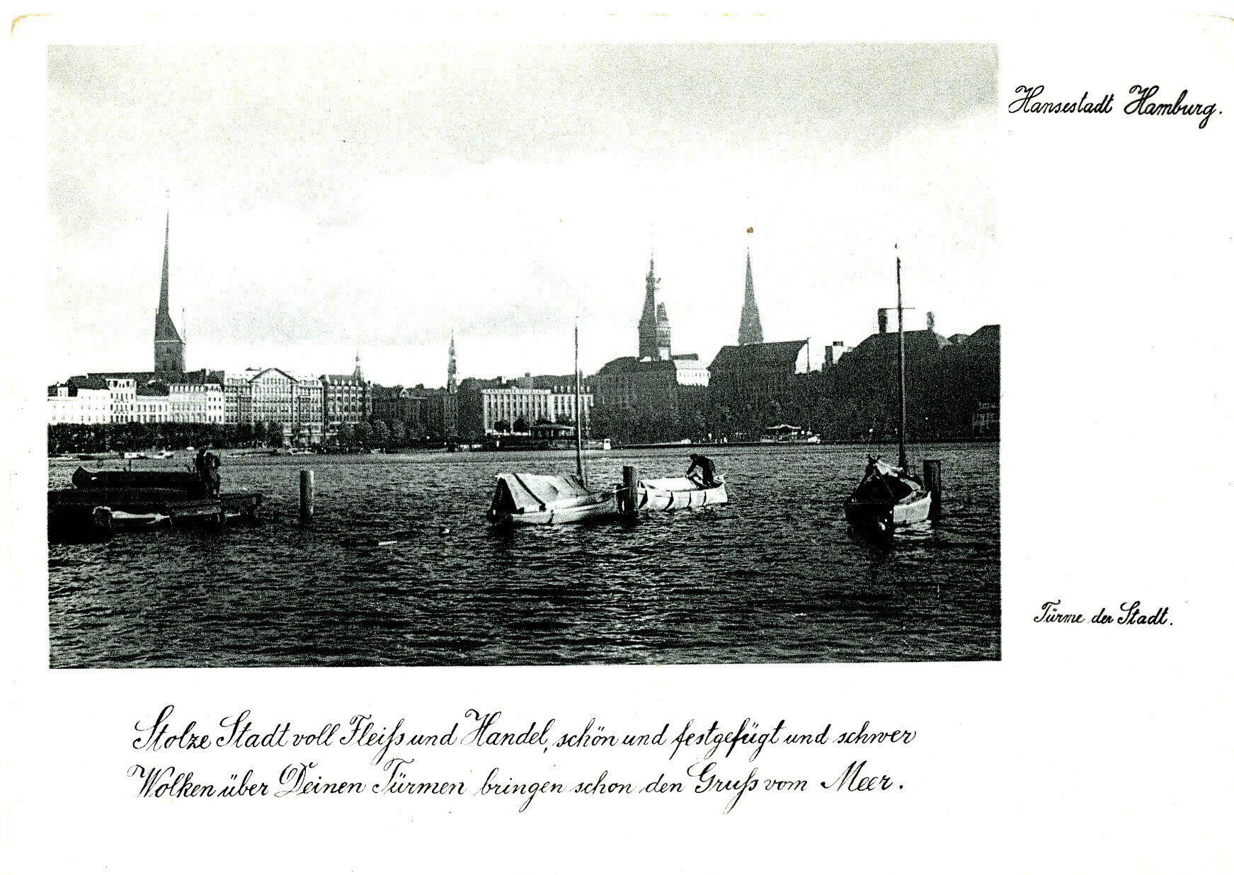 Postcard, picture, real photo. 5 3/4 x 4 b&w. View of harbor with city buildings and church steeples in background, Hamburg, Germany.