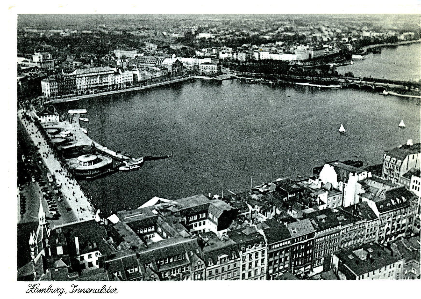 Postcard, picture, real photo. 5 7/8 x 4 b&w. View of inner harbor in Hamburg, Germany.