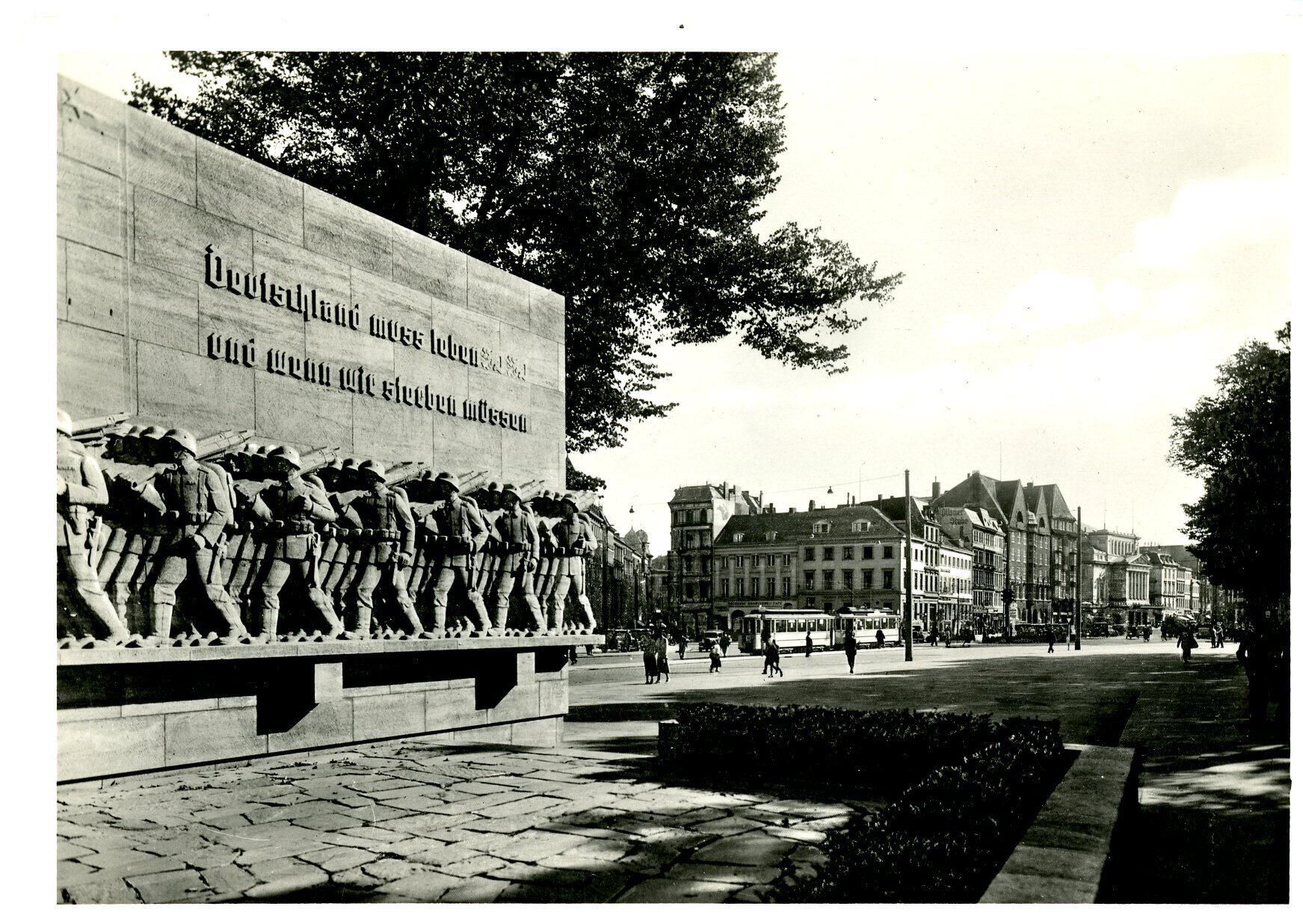 Postcard, picture, real photo. 5 7/8 x 4 b&w. View of monument to 70th Infantry Regiment in Hamburg, Germany.
