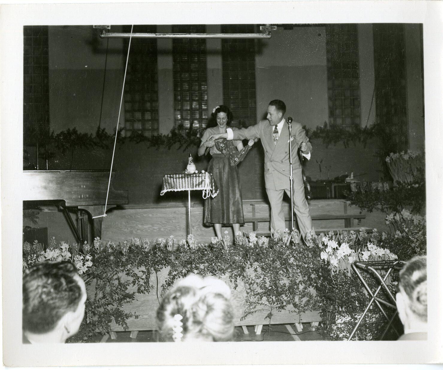 Print, photographic (5). 5 x 4 b&w. Taken February 1950 at Peter G. Schmidt Sr.'s 70th birthday celebration organized by Olympia Brewing Company. Shows unidentified man and woman on stage (performing a magic act?).Name/Title