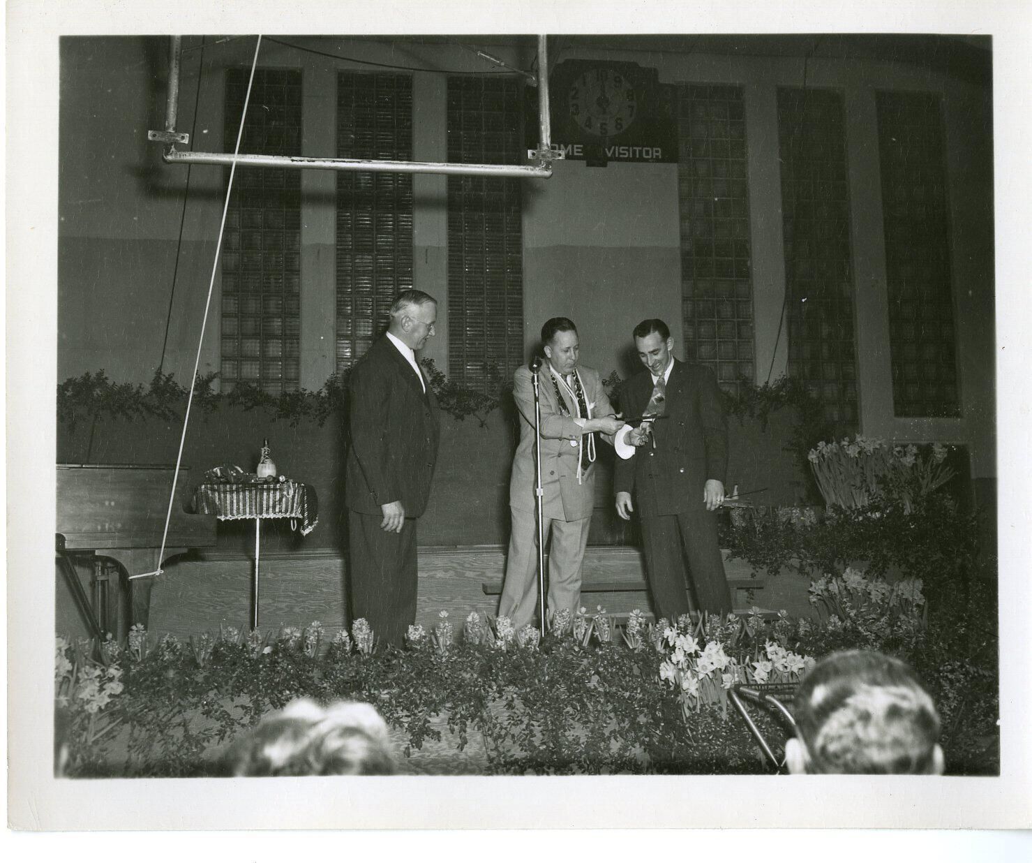 Print, photographic (3). 5 x 4 b&w. Taken February 1950 at Peter G. Schmidt Sr.'s 70th birthday celebration organized by Olympia Brewing Company. Shows 3 unidentified men on stage; middle man is probably a magician.Name/Title