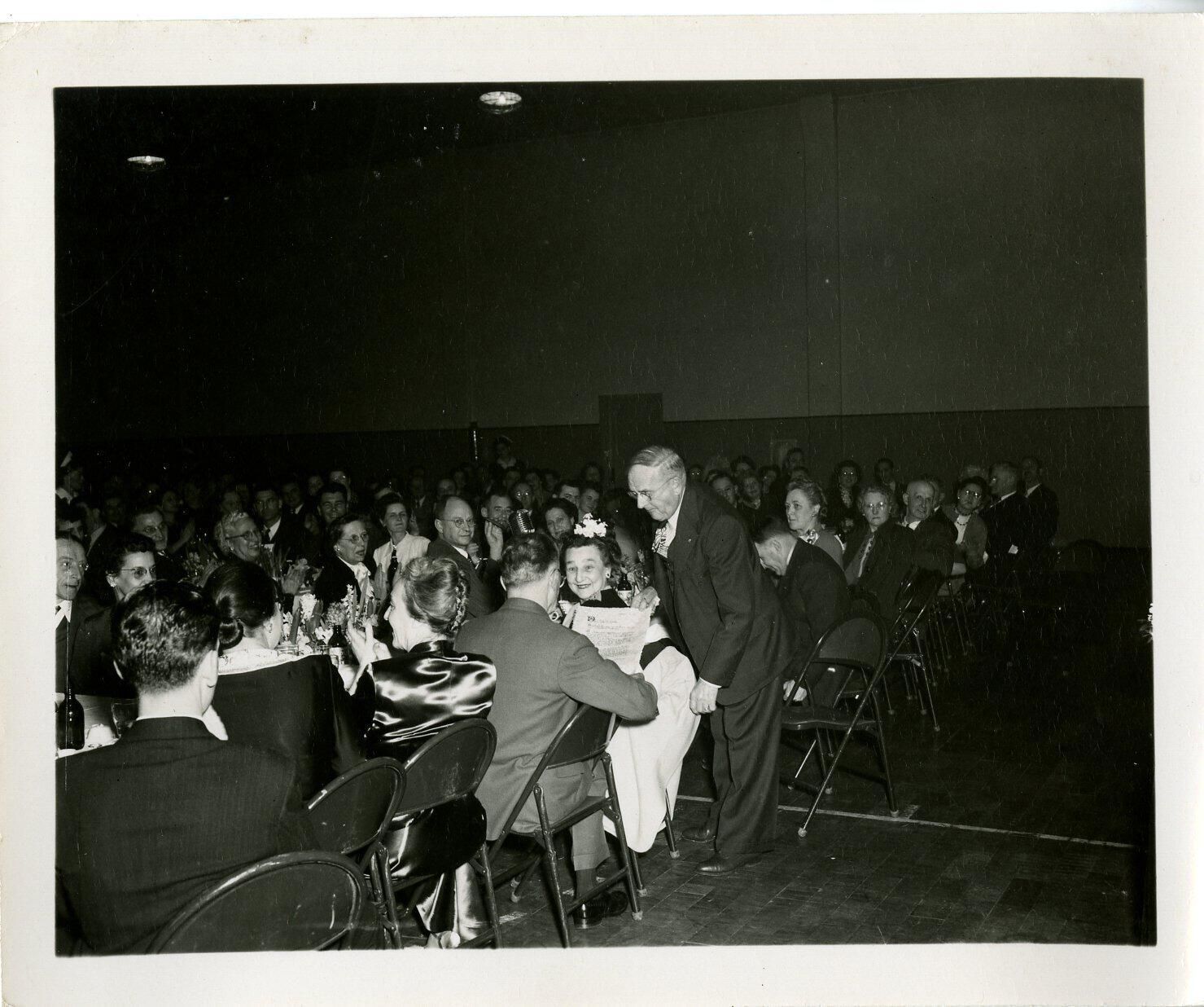 Print, photographic (3). 5 x 4 b&w. Taken February 1950 at Peter G. Schmidt Sr.'s 70th birthday celebration organized by Olympia Brewing Company. Shows Peter receiving and looking at a present; Clara to one side; unidentified man standing.Name/Title