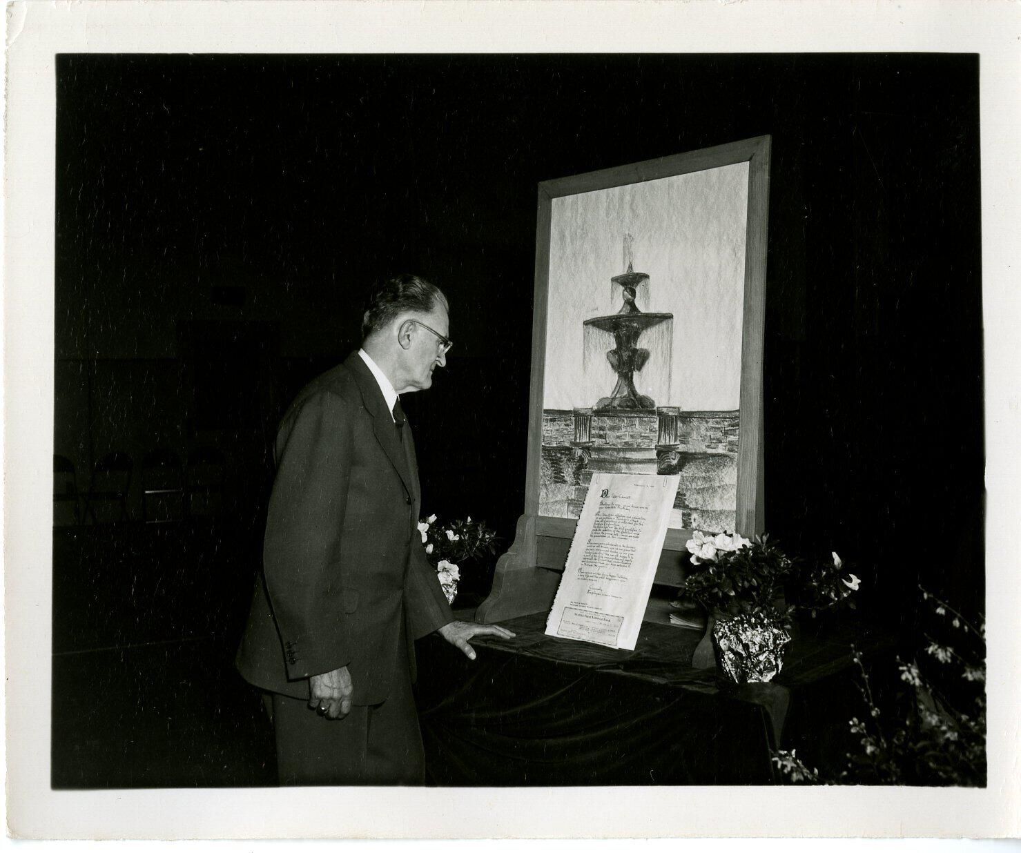 Print, photographic (1). 5 x 4 b&w. Taken February 1950 at Peter G. Schmidt Sr.'s 70th birthday celebration organized by Olympia Brewing Company. Shows Peter looking at painting of fountain.