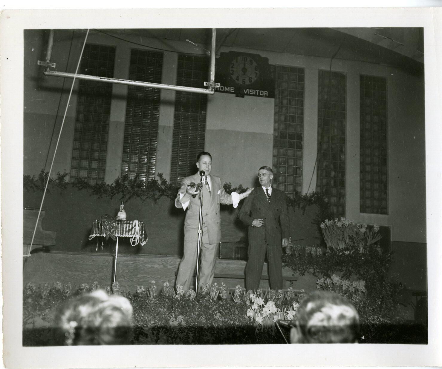 Print, photographic (3). 5 x 4 b&w. Taken February 1950 at Peter G. Schmidt Sr.'s 70th birthday celebration organized by Olympia Brewing Company. Shows 2 unidentified men standing on stage; man on left is probably a magician.Name/Title