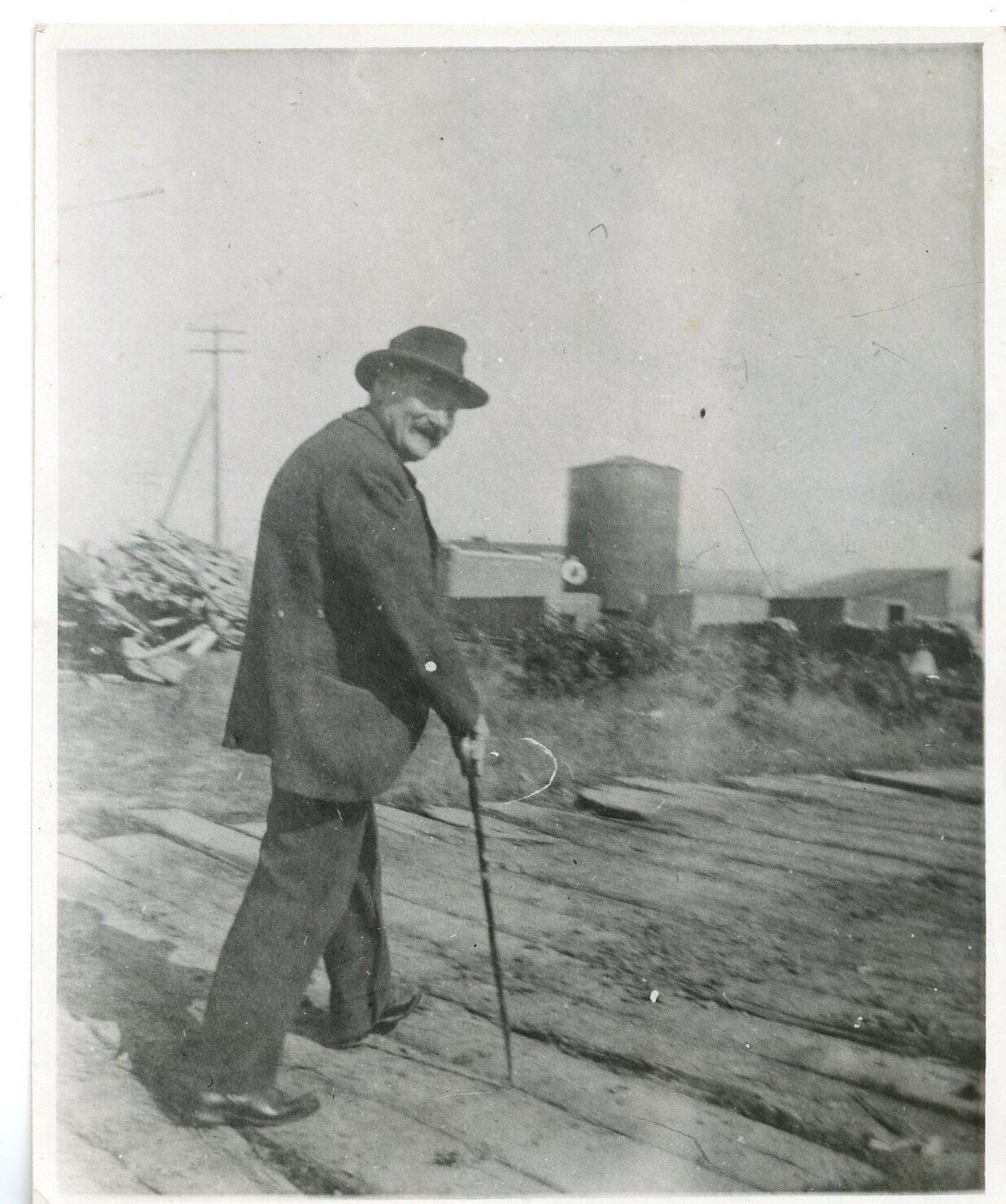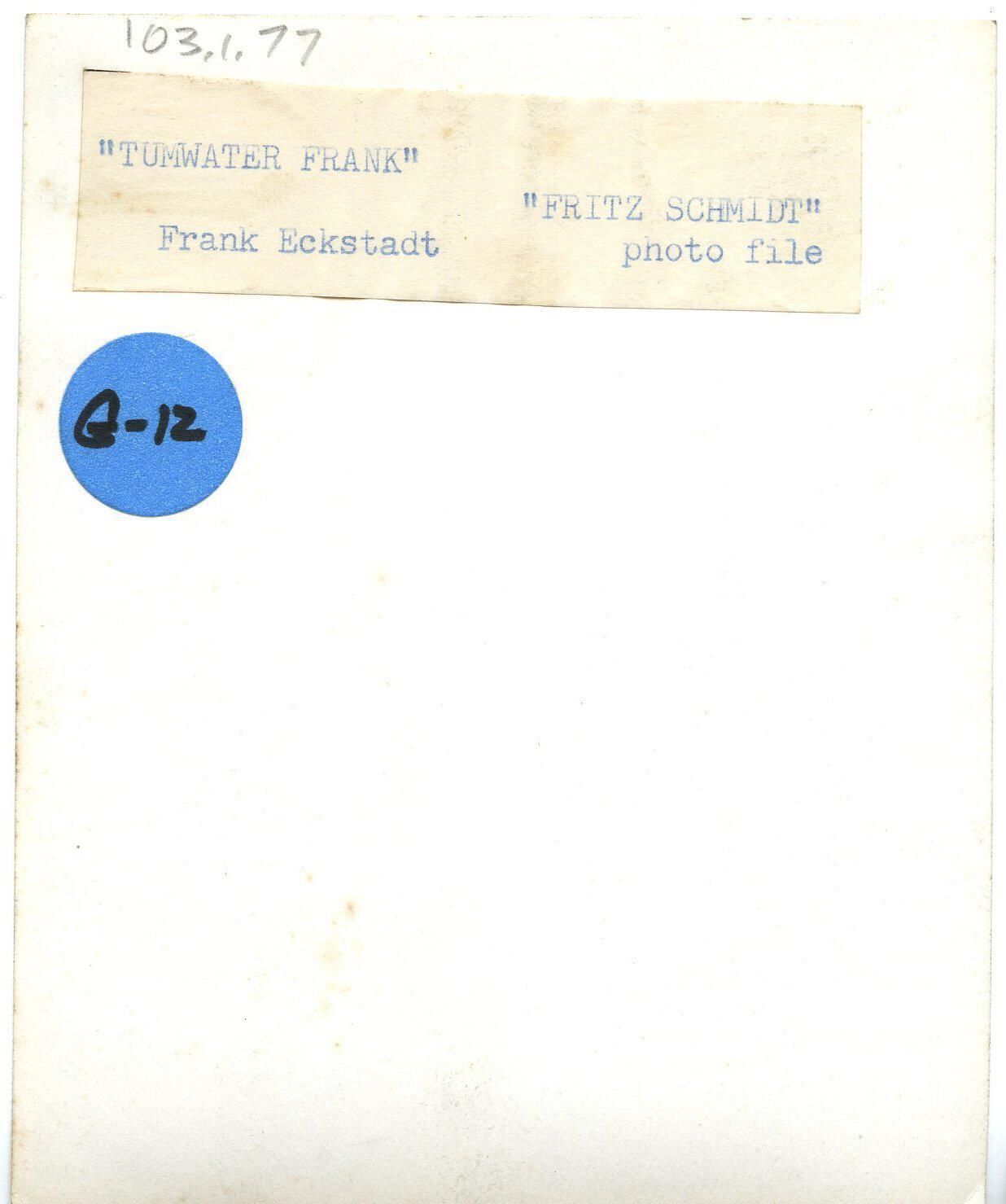 Print, photographic (1). 4 x 5 b&w. Shows Frank Eckstadt, "Tumwater Frank," walking on plank road or plank sidewalk with buildings and lumber pile in background. On back of photo is typed label noting "Fritz Schmidt" photo file.Name/Title