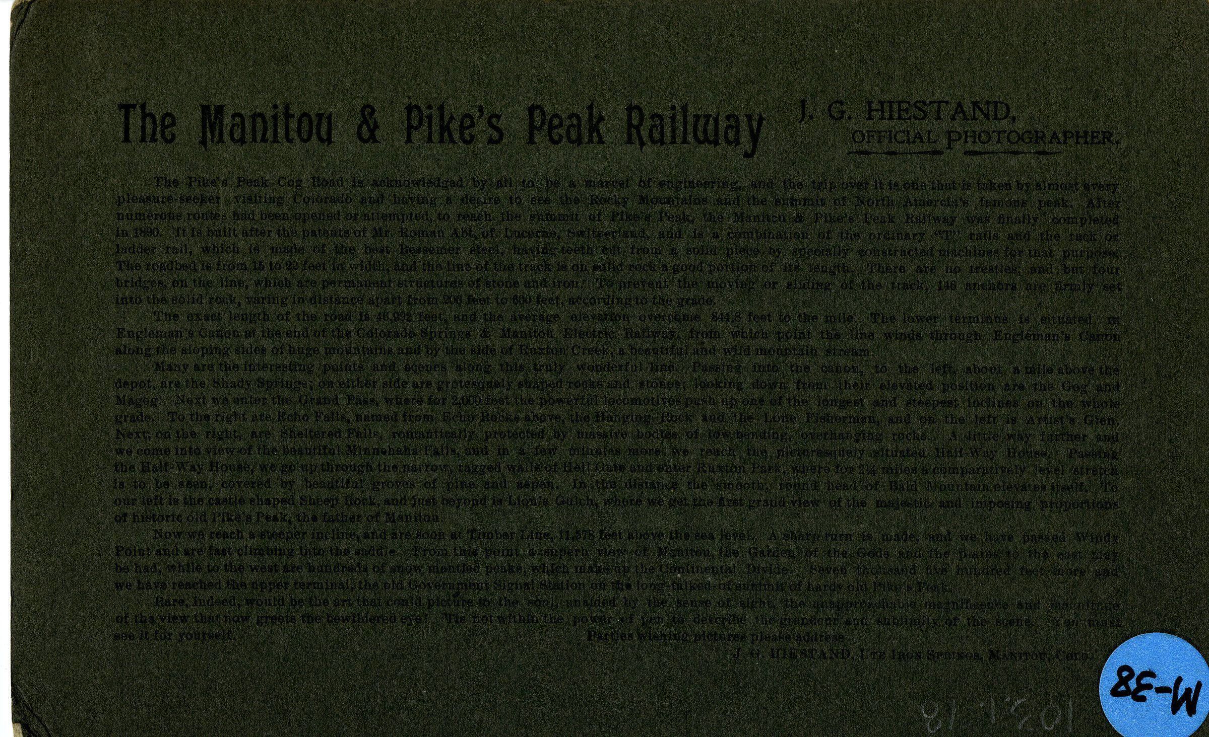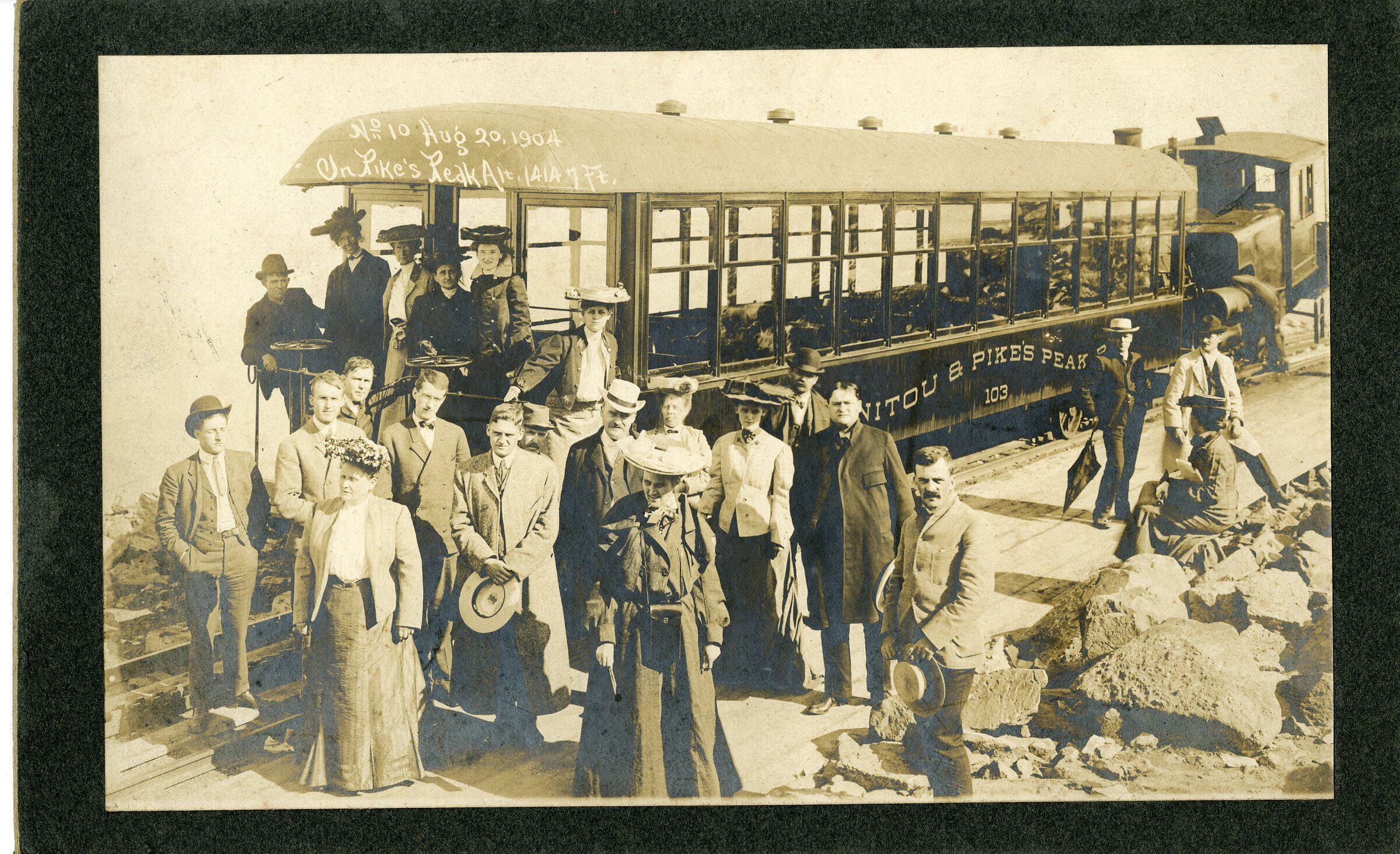 Photograph, cabinet (2). 7 x 4 1/4 sepia. Mounted on 8 x 5 dark brown cardboard. Shows cog railway car with crowd of people, engine in background. Labeled "No. 10, Aug 20, 1904 on Pike's Peak Alt 14147 Ft." Rail car reads "Manitou & Pike's Peak 103." Back of card has lengthy description of the railway and area.Name/Title