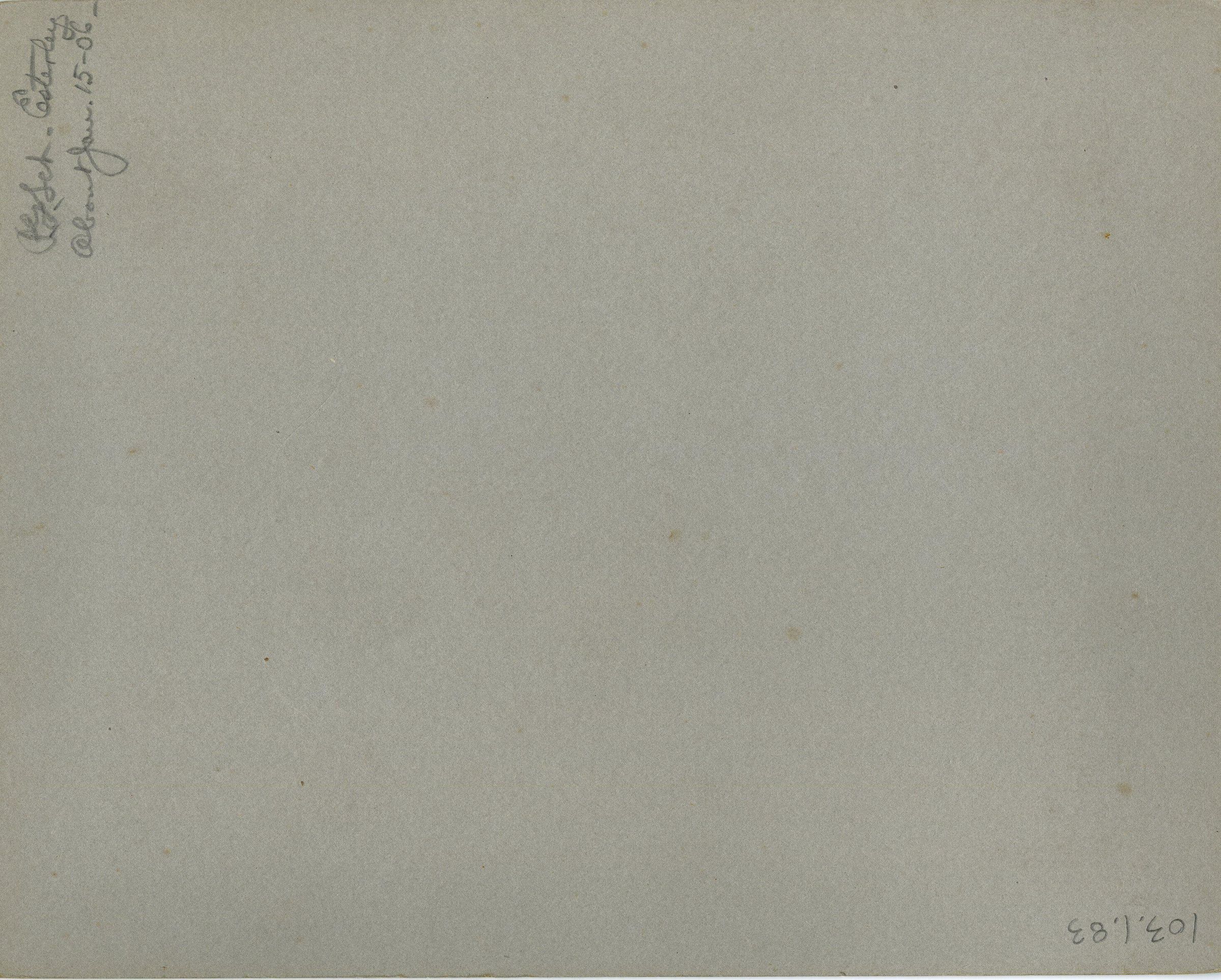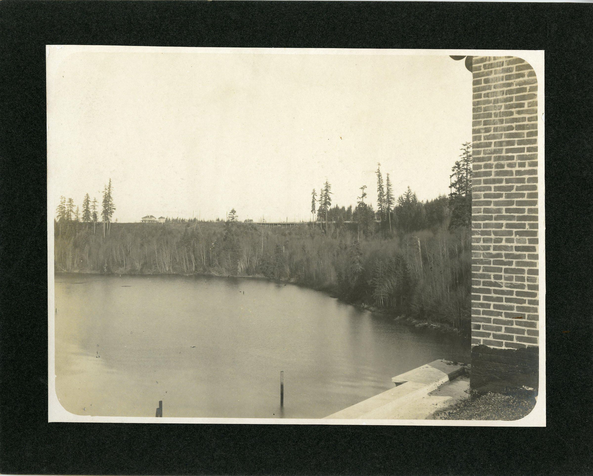 Photograph, cabinet. 8 x 6 b&w, mounted on 10 x 8 dark brown cardboard. Shows view of lake and hill to northeast of Tumwater brewery; right side of photo shows, presumably, portion of brick brewery building. Back of photo reads "P. G. Sch. Esterley About Jan. 15-06"Name/Title