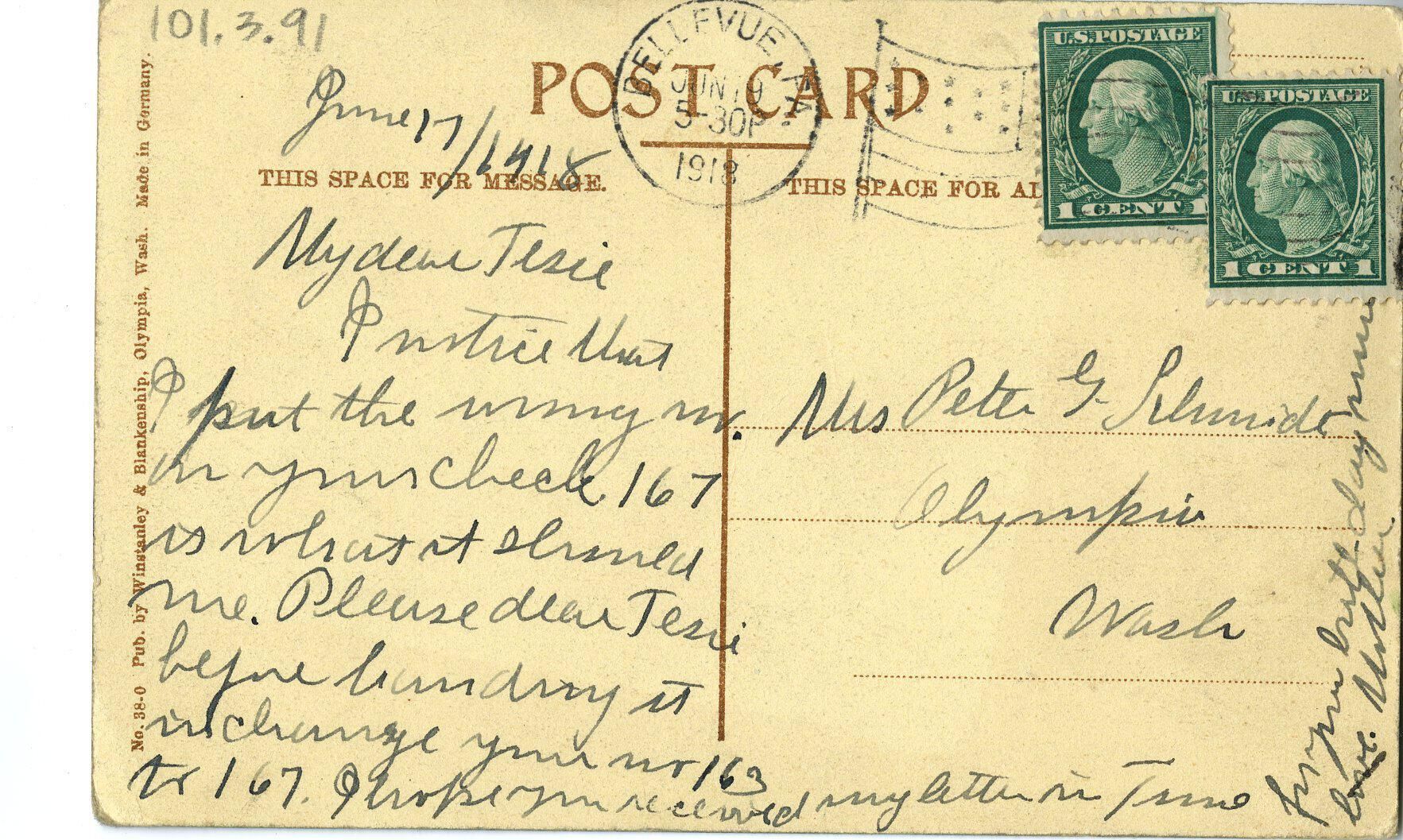Postcard, picture. 5 1/2 x 3 1/2 color. Scene of Olympia Brewery, "It's the Water," Olympia, Wash. Shows brewery from Olympia hill, looking southwest. Message on back from "Mother" to Mrs. Peter G. Schmidt (Clara). Sent from Bellevue PA to Olympia WA. Although the postcard is postmarked 1918, the photo was from 1906-1909.Name/Title