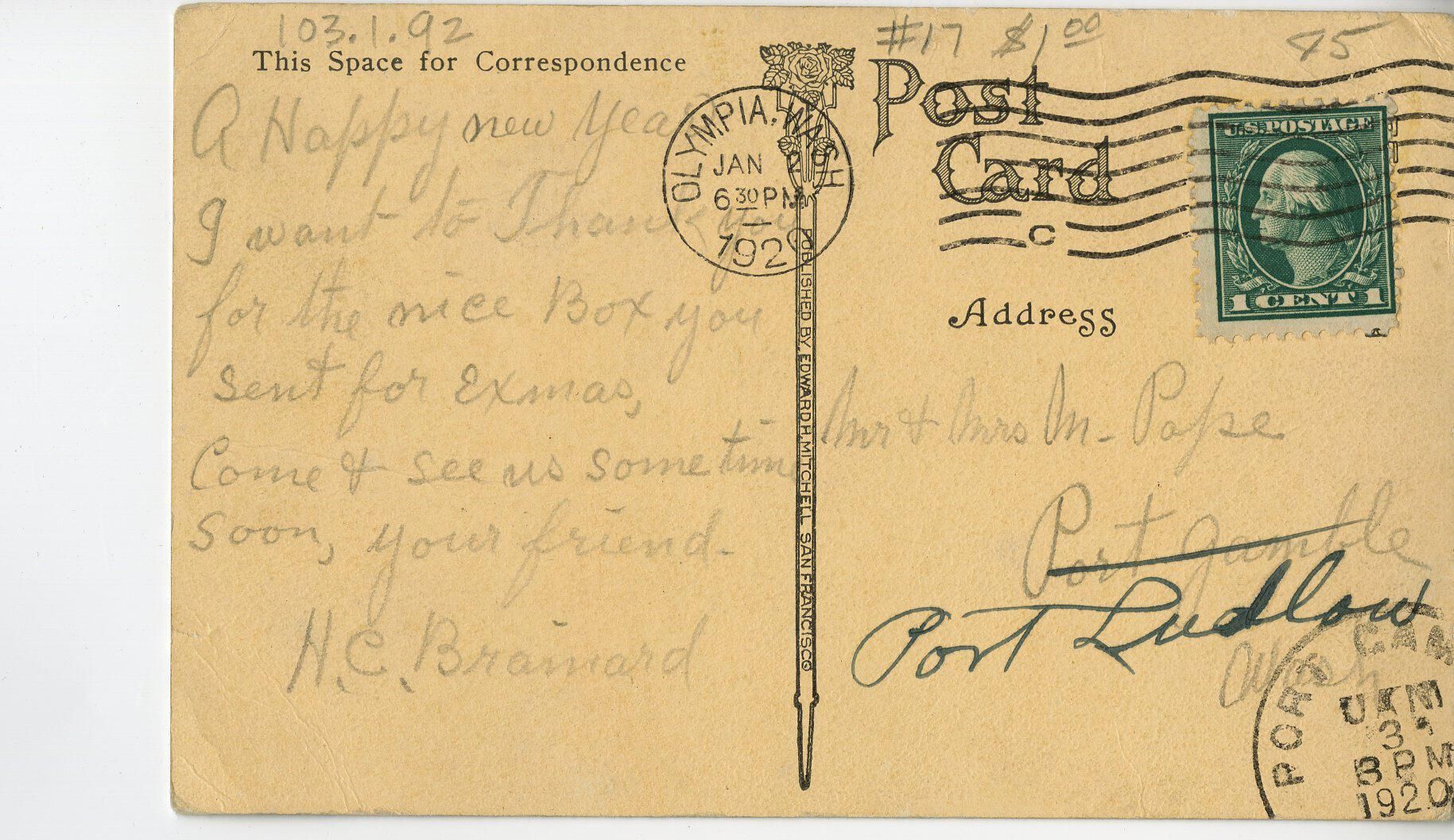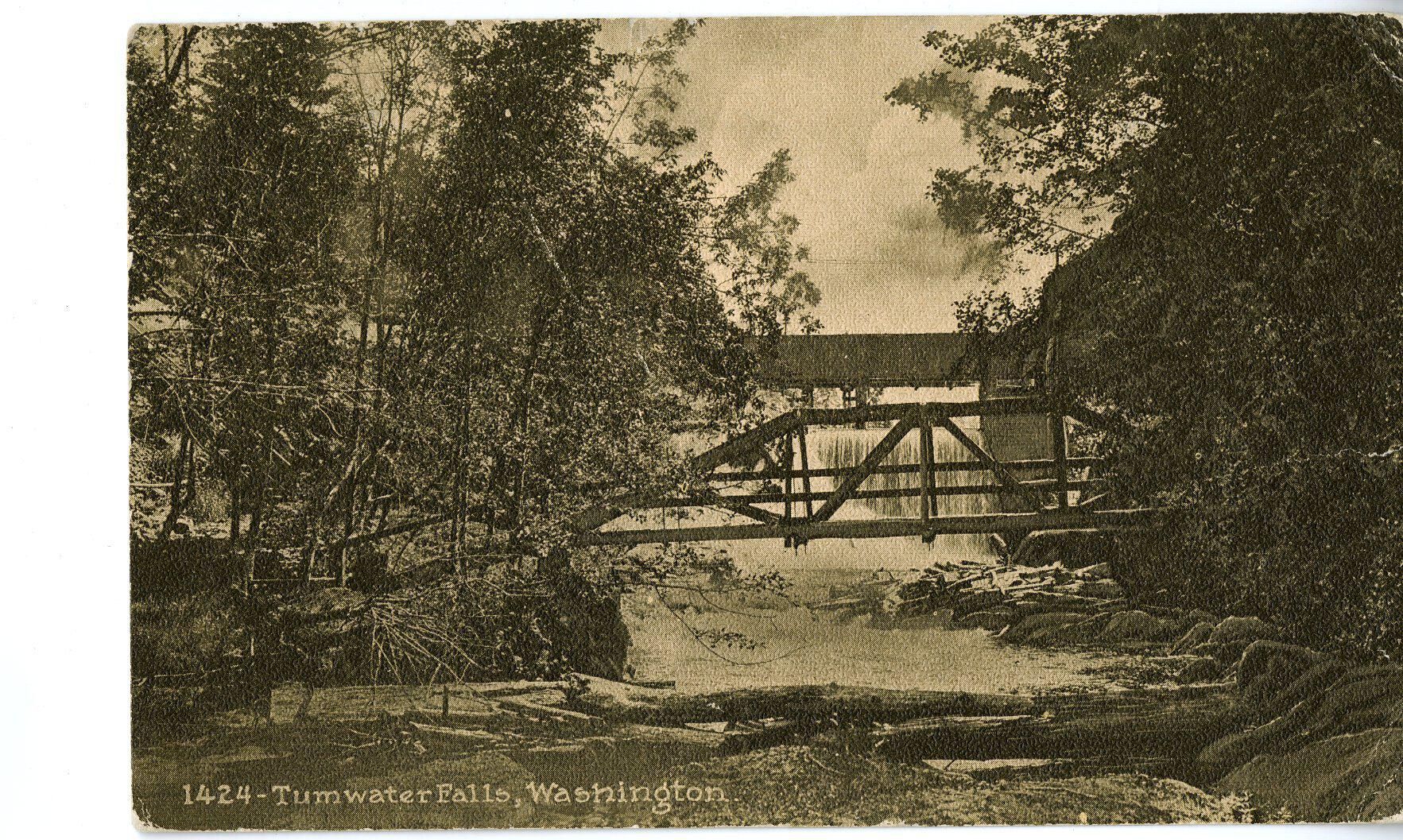 Postcard, picture. 5 1/2 x 3 1/2 sepia. Scene of Tumwater Falls, Wash. Shows bridge over falls. Message on back from H. C. Brainard, Olympia WA to Mr. and Mrs. Pape, Port Ludlow WA.