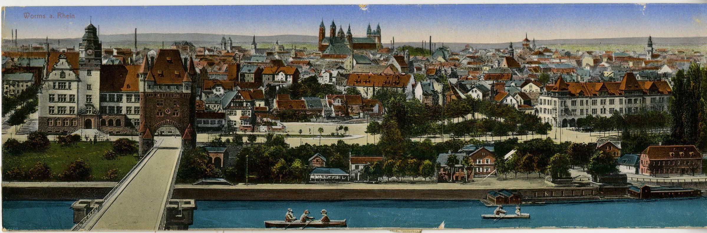 Postcard, picture. 11 x 3 1/2 color. Panoramic view of Worms, Germany.
