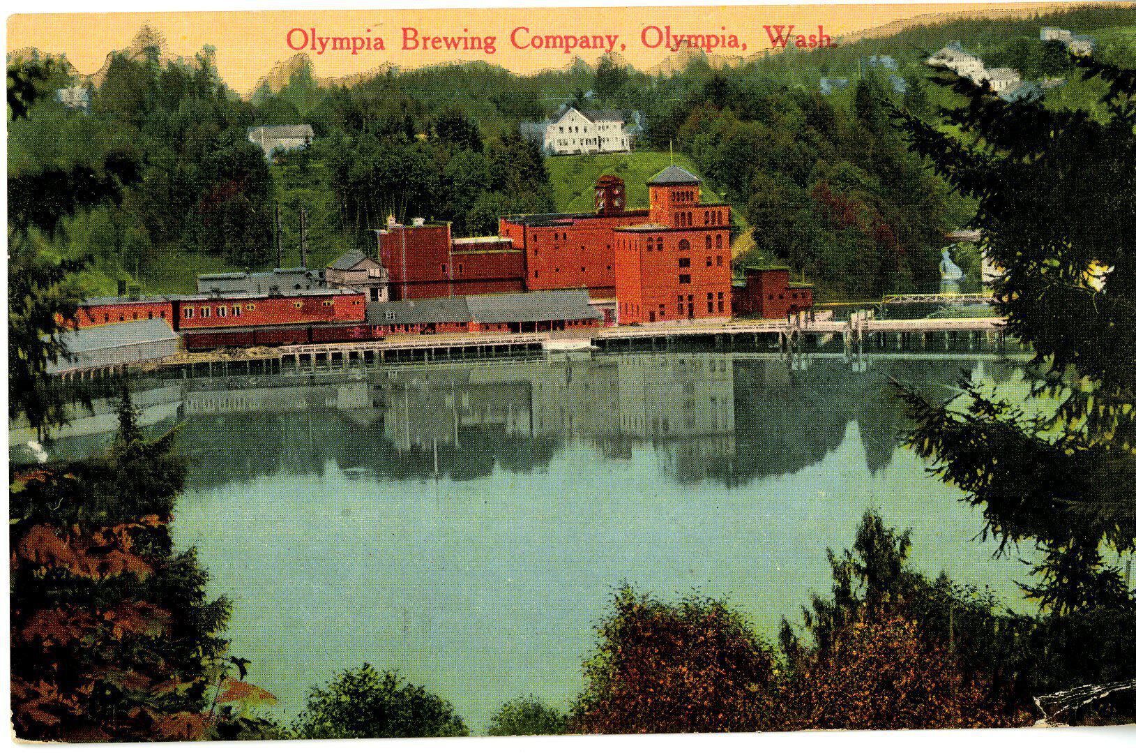 Postcard, picture (8). 3 1/2 x 5 1/2 color. View of Olympia Brewing Company, Olympia, Wash. View from north; shows Schmidt House in background.